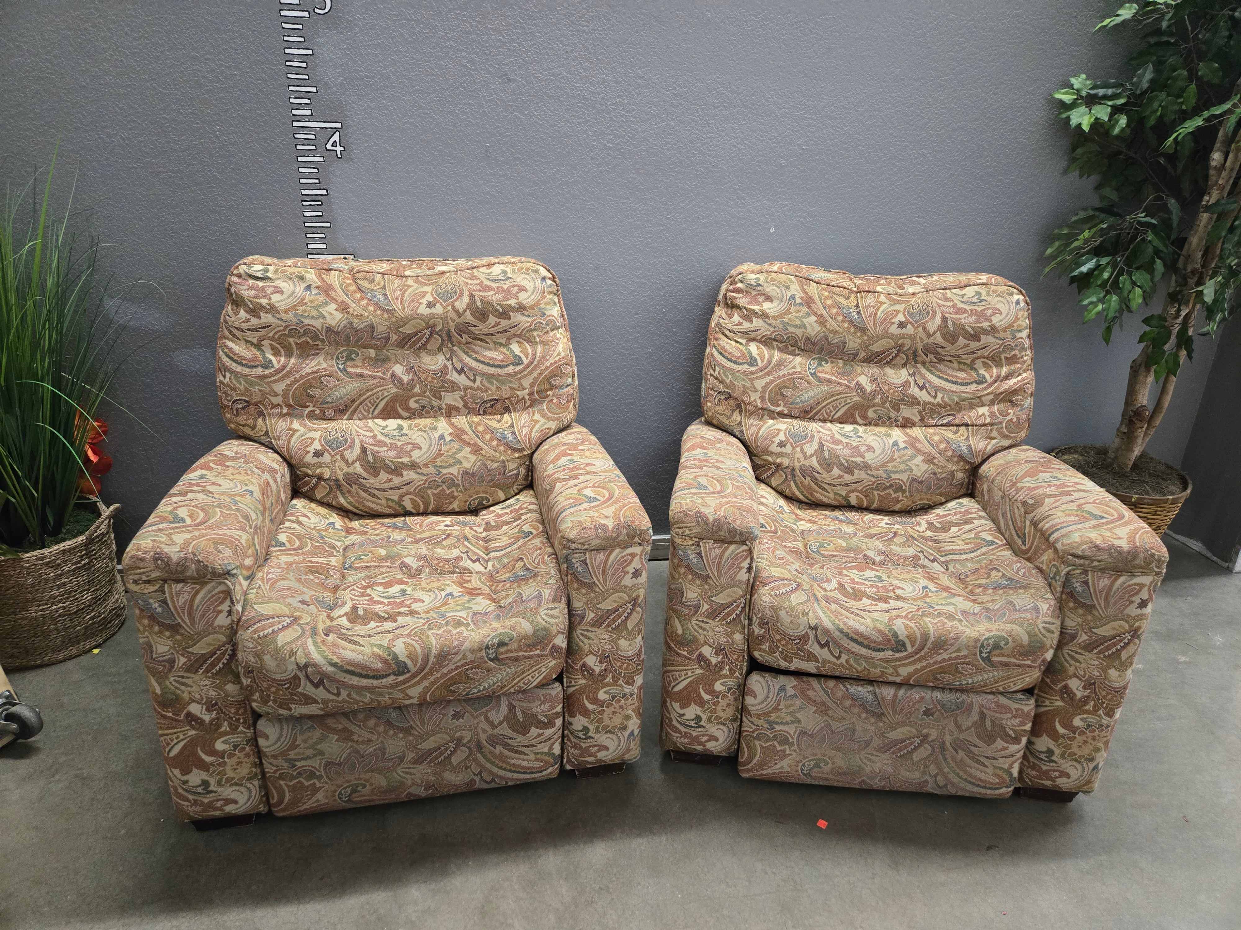 This set of two recliners features a colorful paisley pattern in earthy tones with a soft fabric finish. Perfect for adding a touch of classic elegance to your living room. Approximate Size: 3.5 x 3 x 3
