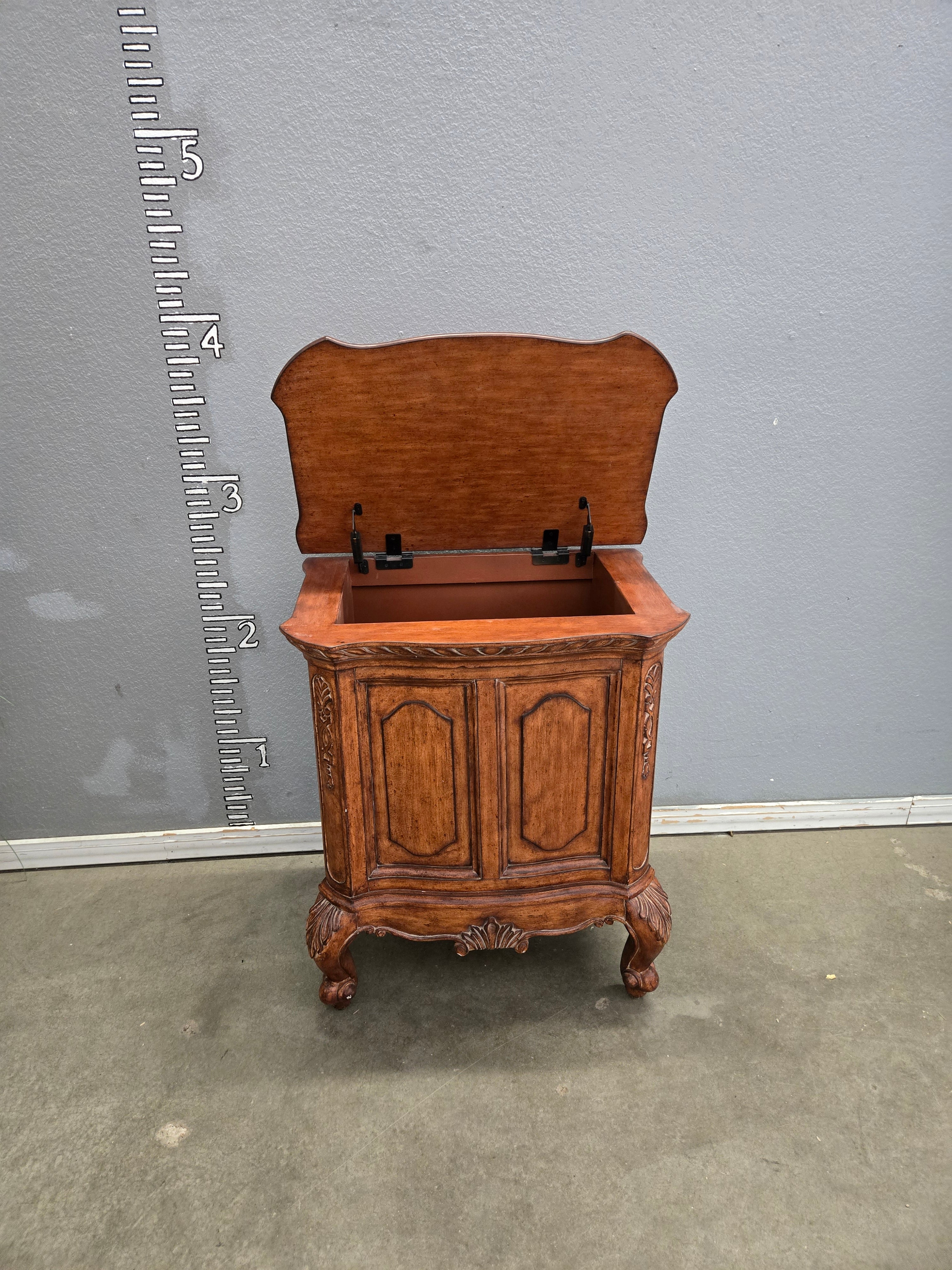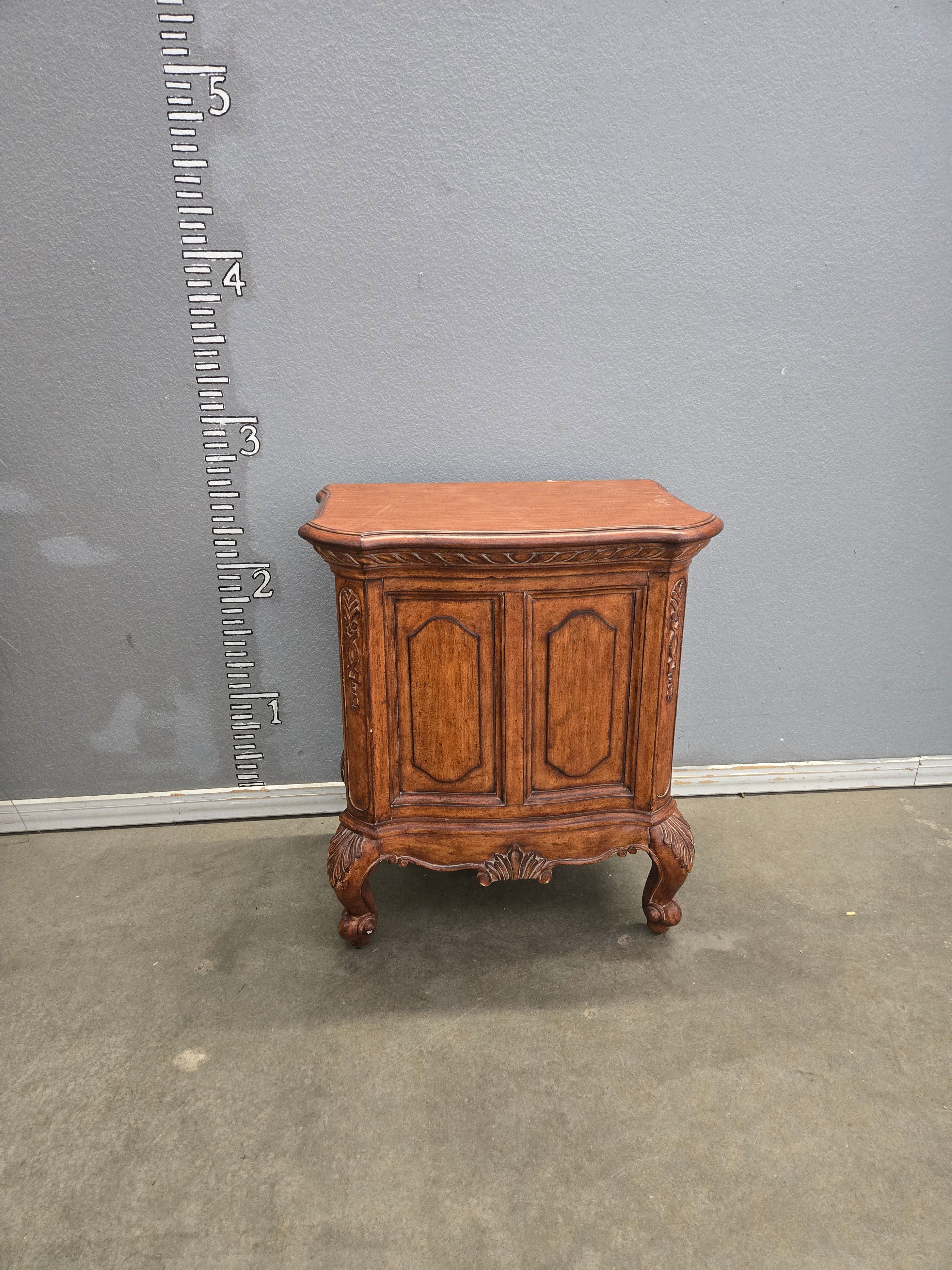 This beautifully crafted wooden cabinet features a rich brown finish with intricate carved details. Its antique style adds a touch of elegance to any room. Approximate Size: 3 x 2 x 1.5