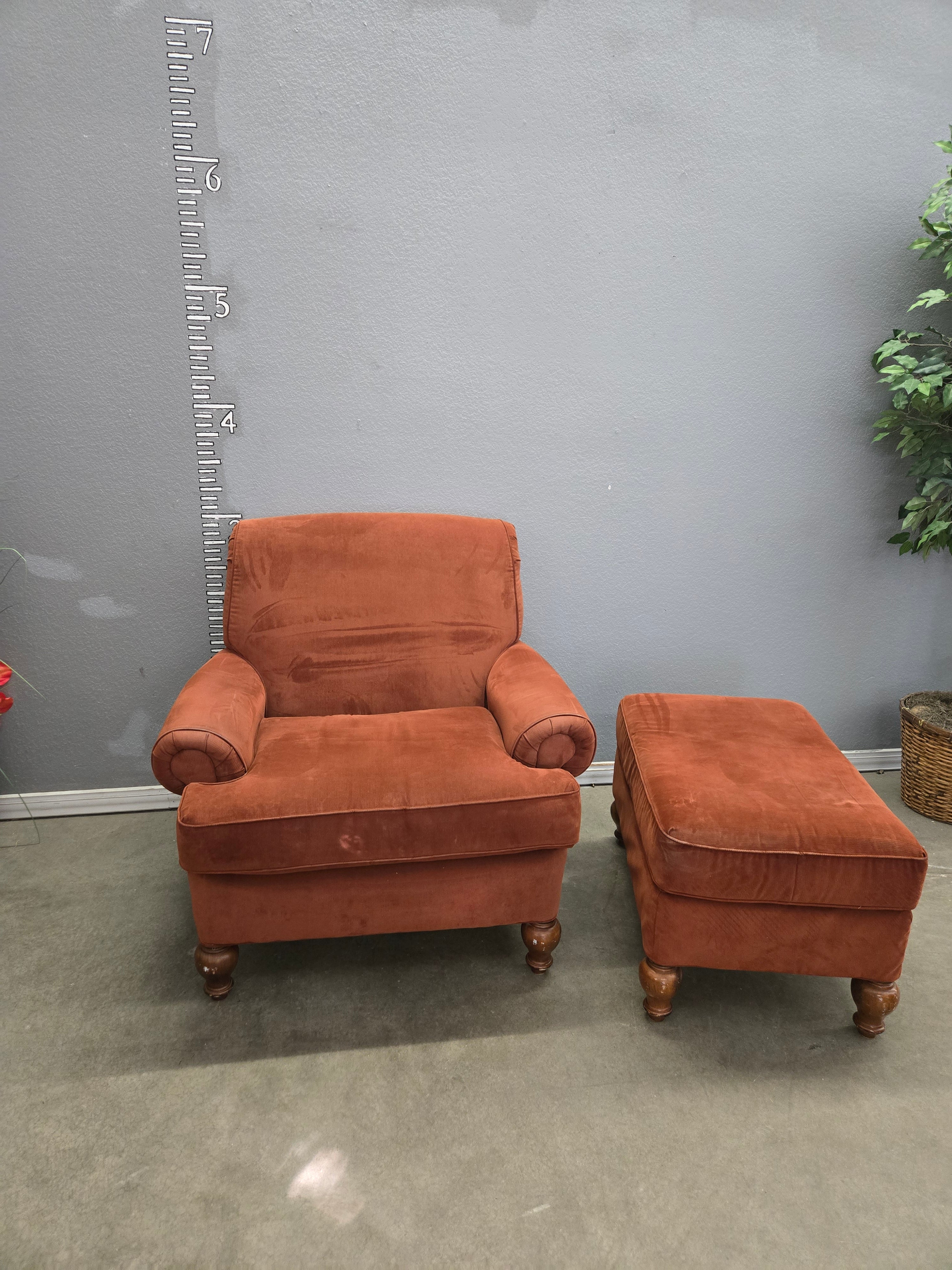 This vintage armchair and ottoman set features a rich rust velvet fabric with a plush, luxurious finish. The classic rolled arms and wooden turned legs add a touch of elegance. Approximate Size: 3 x 3 x 3