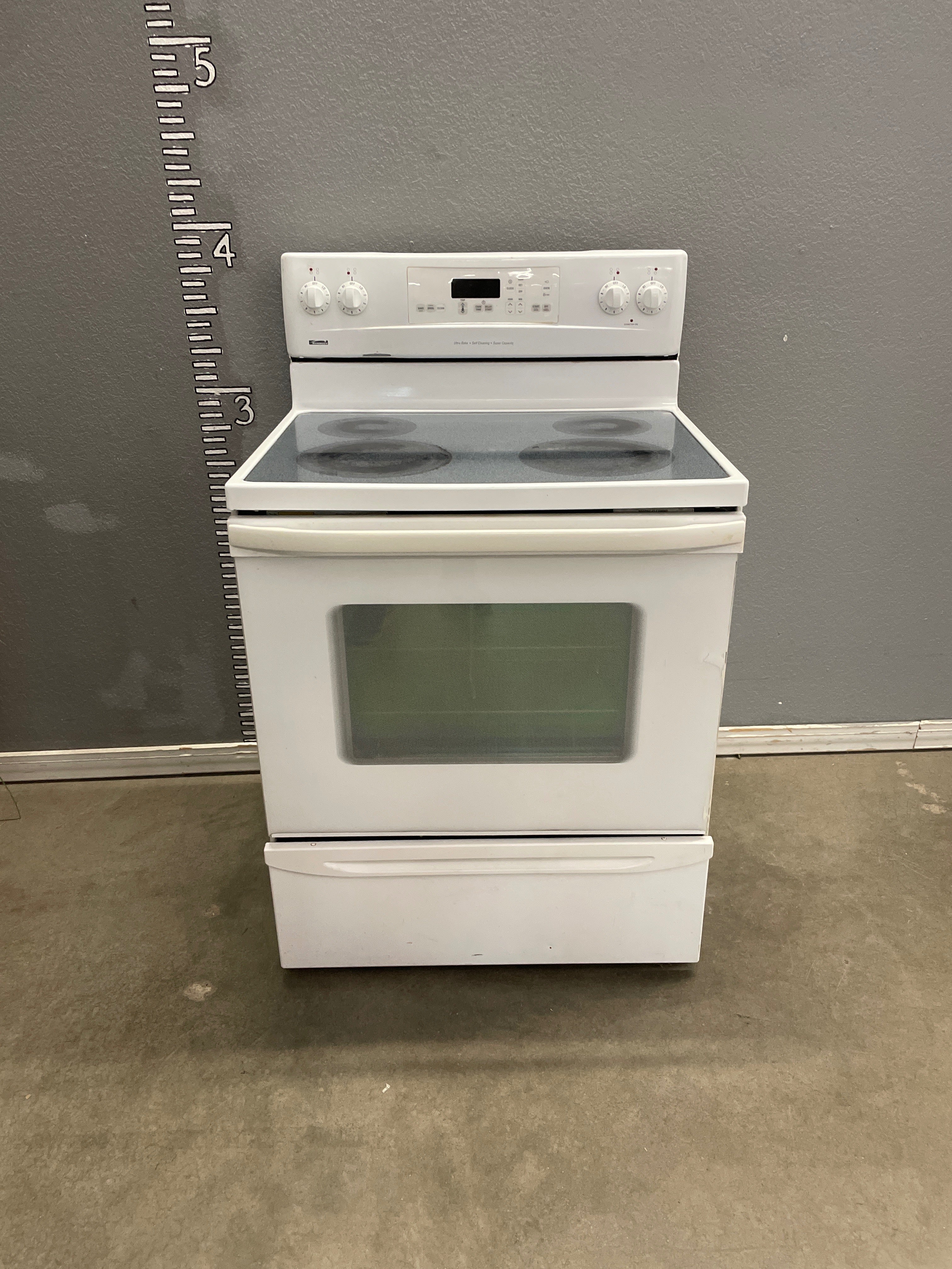 This white freestanding electric range features a sleek glass cooktop and a spacious oven with a viewing window. The appliance has a smooth, modern finish ideal for any kitchen setting. Approximate Size: 4 x 2.5 x 2.5
