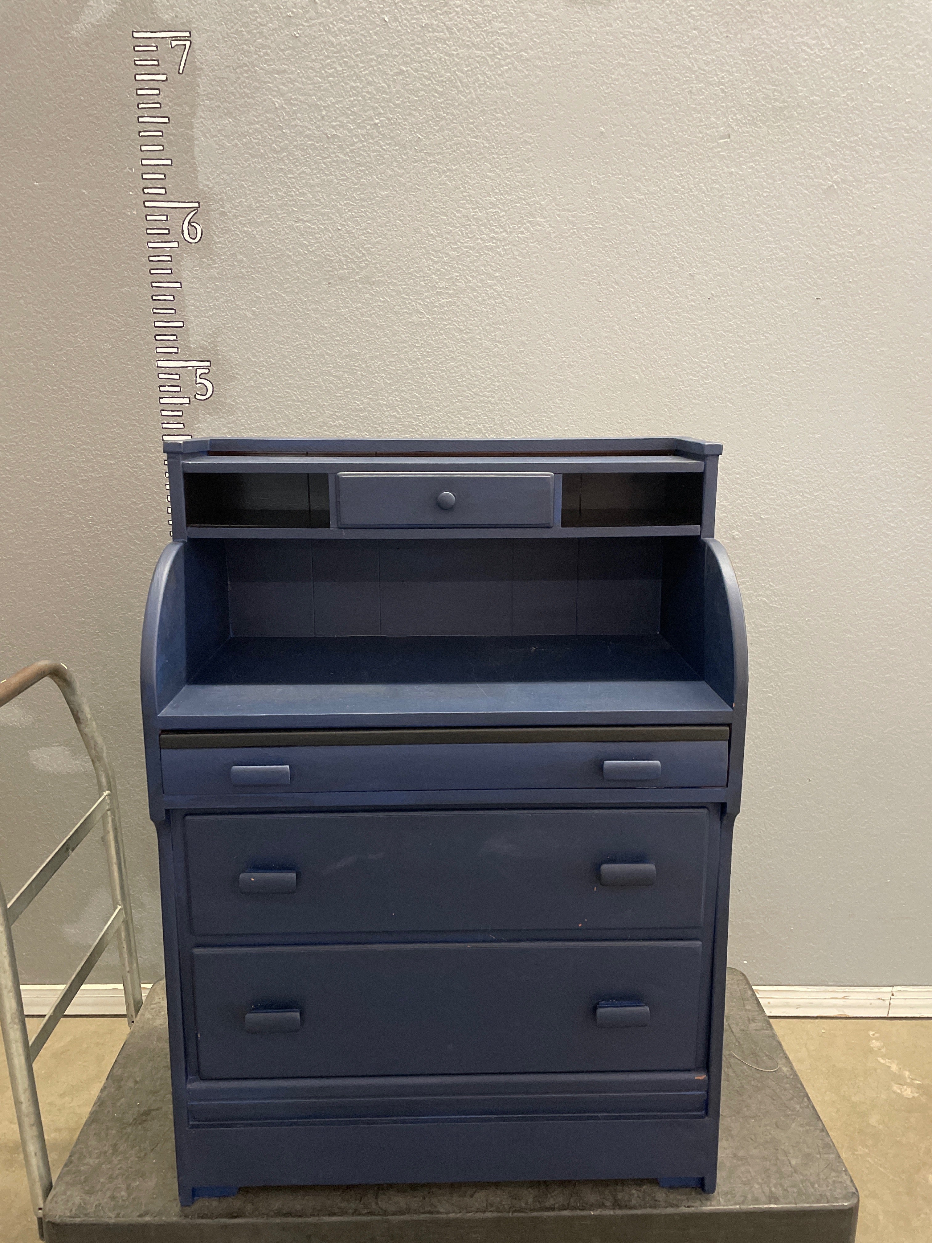 This vintage navy blue dresser features a smooth matte finish. It comes with three spacious drawers and an upper hutch for additional storage. Perfect for adding a touch of classic elegance to any room. Approximate Size: 5 x 3 x 1.5