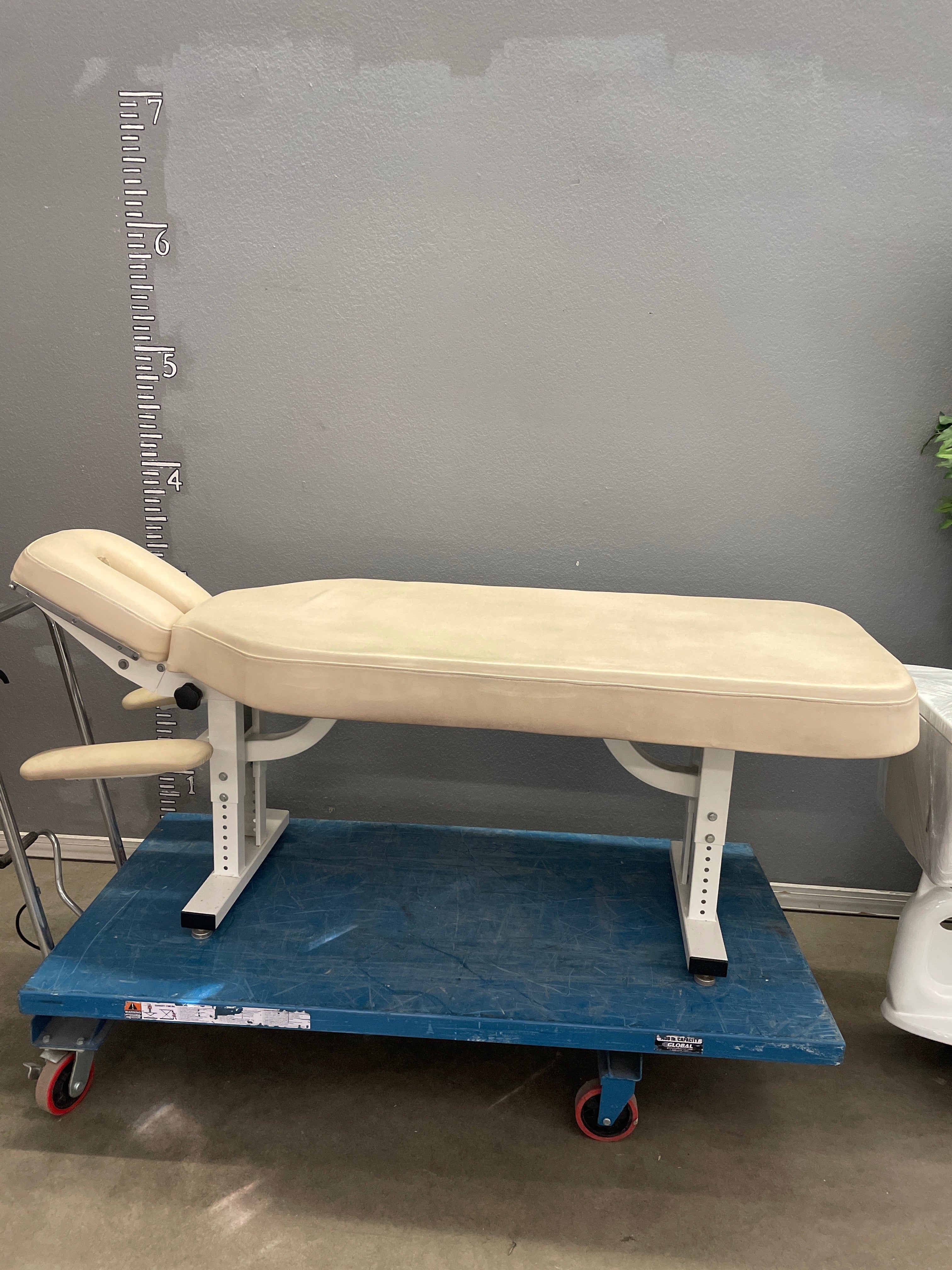 Tan adjustable massage table with a soft, durable fabric finish. Ideal for therapeutic settings. Approximate Size: 3 x 6 x 2.5