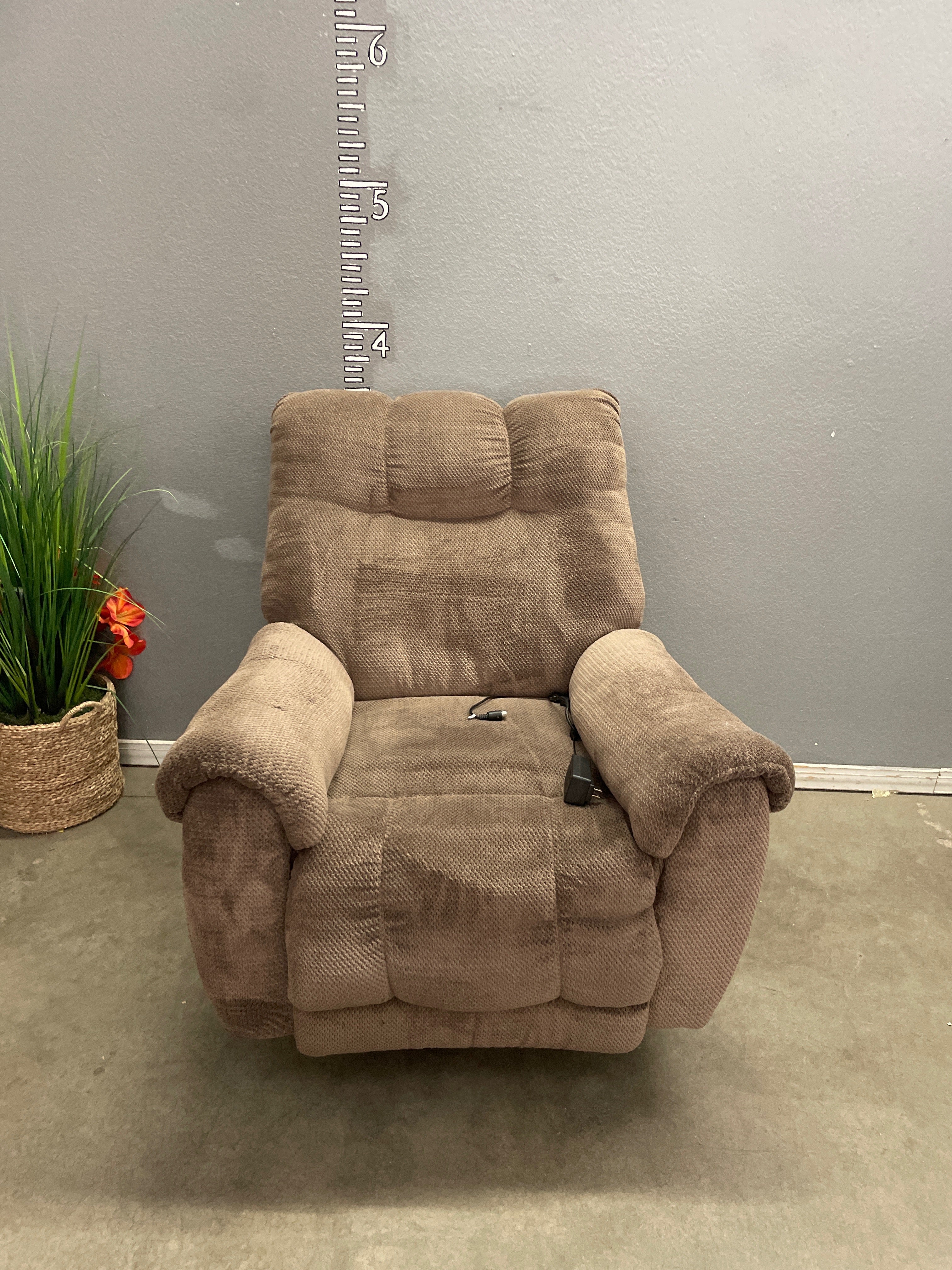 A comfortable recliner upholstered in a soft, brown plush fabric, offering a relaxing seating experience with a smooth finish. Approximate Size: 4 x 3 x 3