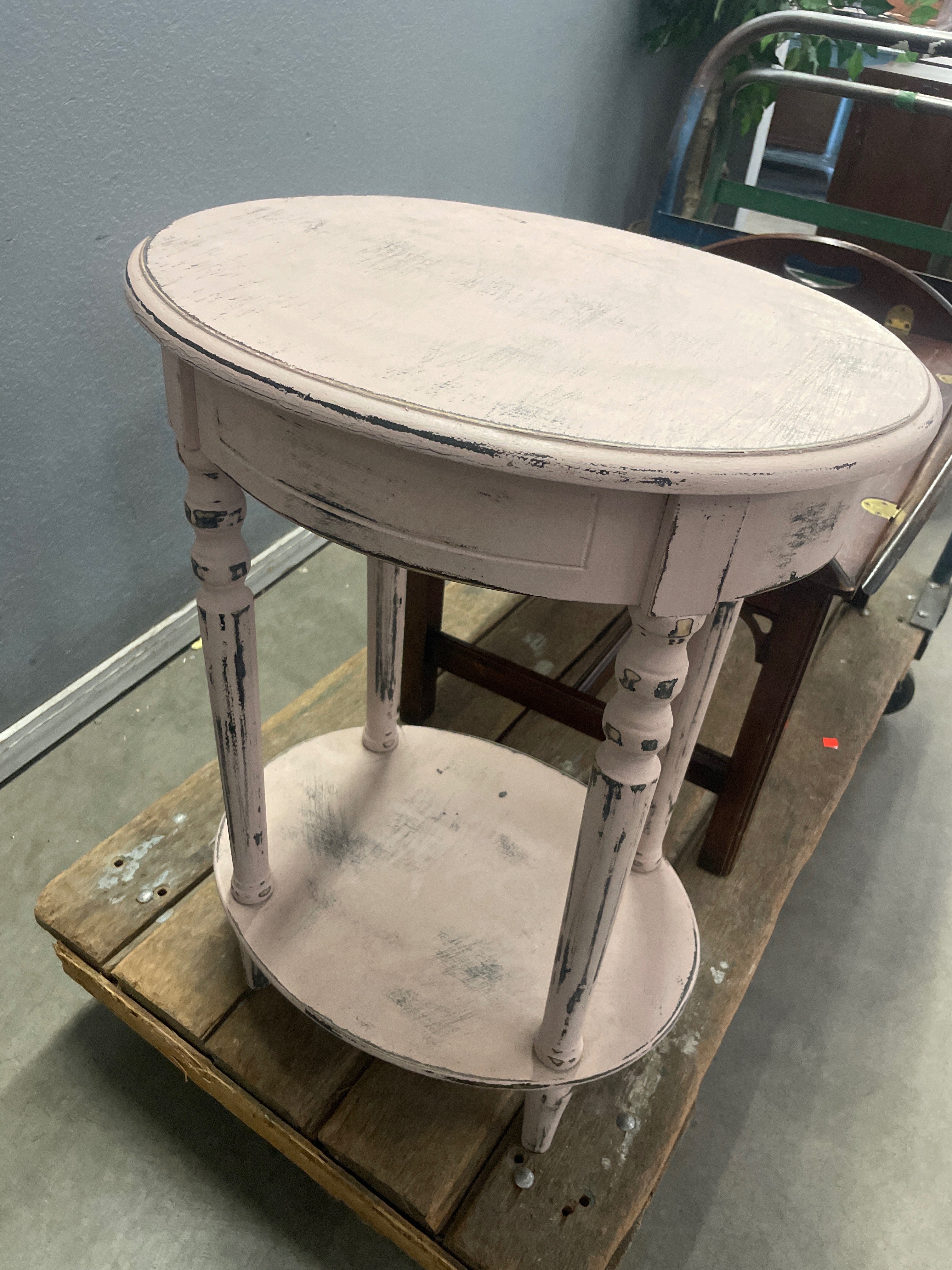 This charming vintage side table features a distressed pink finish, adding a shabby chic touch to any room. The table is crafted with sturdy wood and offers two tiers for extra storage or display. Approximate Size: 2.5 x 2 x 1.5