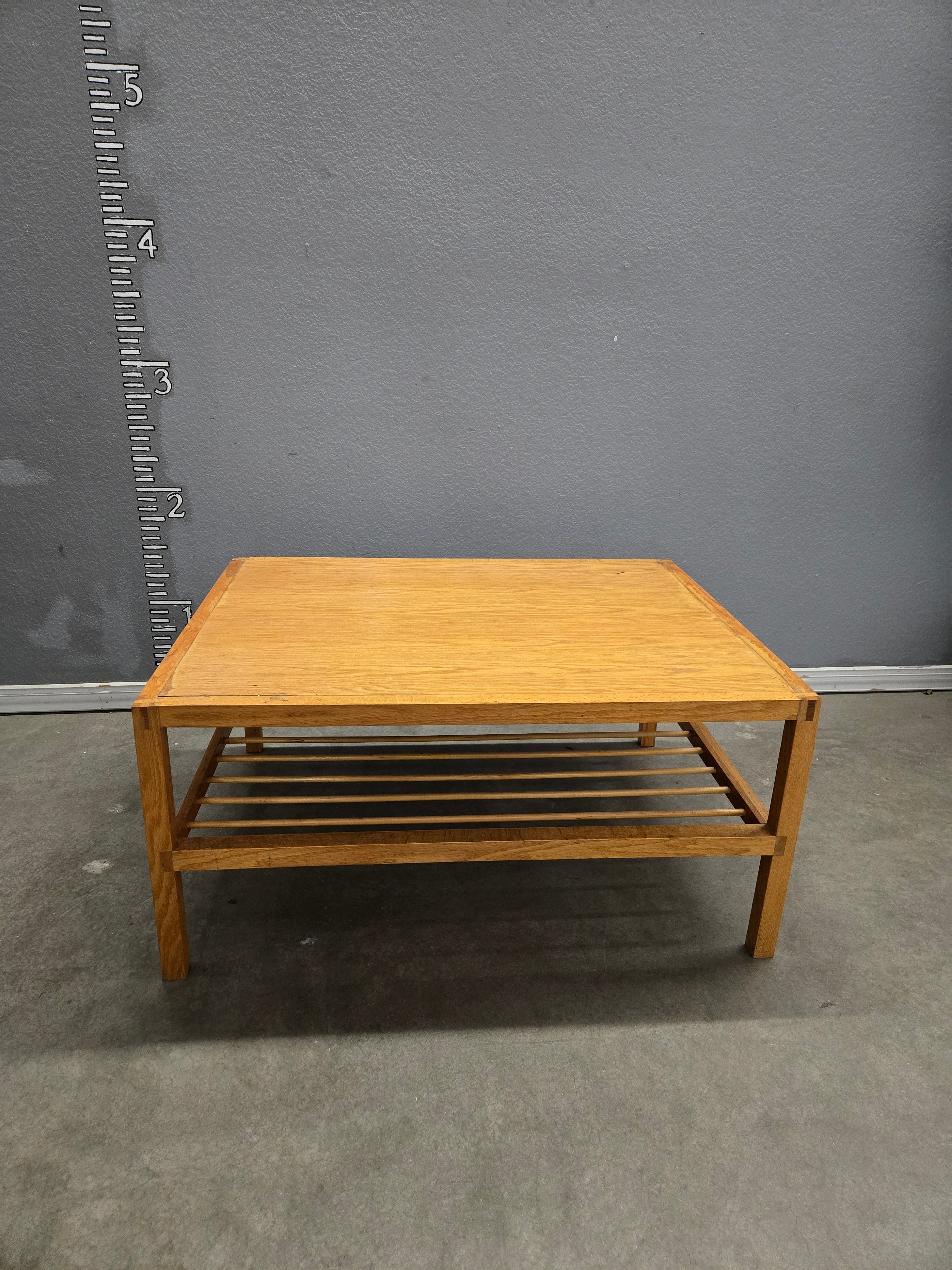 This elegant coffee table features a natural wood color with a smooth, matte finish. The design includes a slatted lower shelf, perfect for storage or display. Approximate Size: 1.5 x 3 x 3