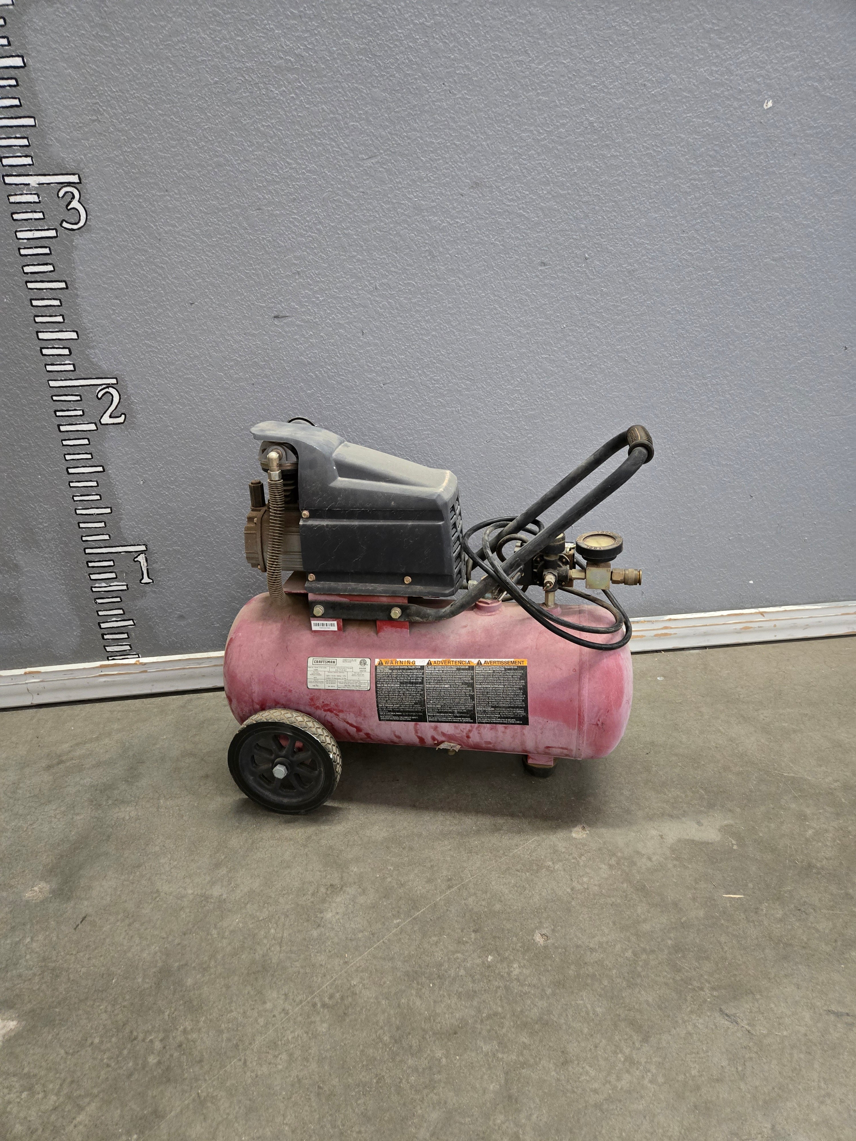 This compact air compressor features a pink cylindrical tank with a durable black and gray motor housing. The unit comes equipped with a handle for easy maneuverability. Approximate Size: 2 x 1.5 x 1