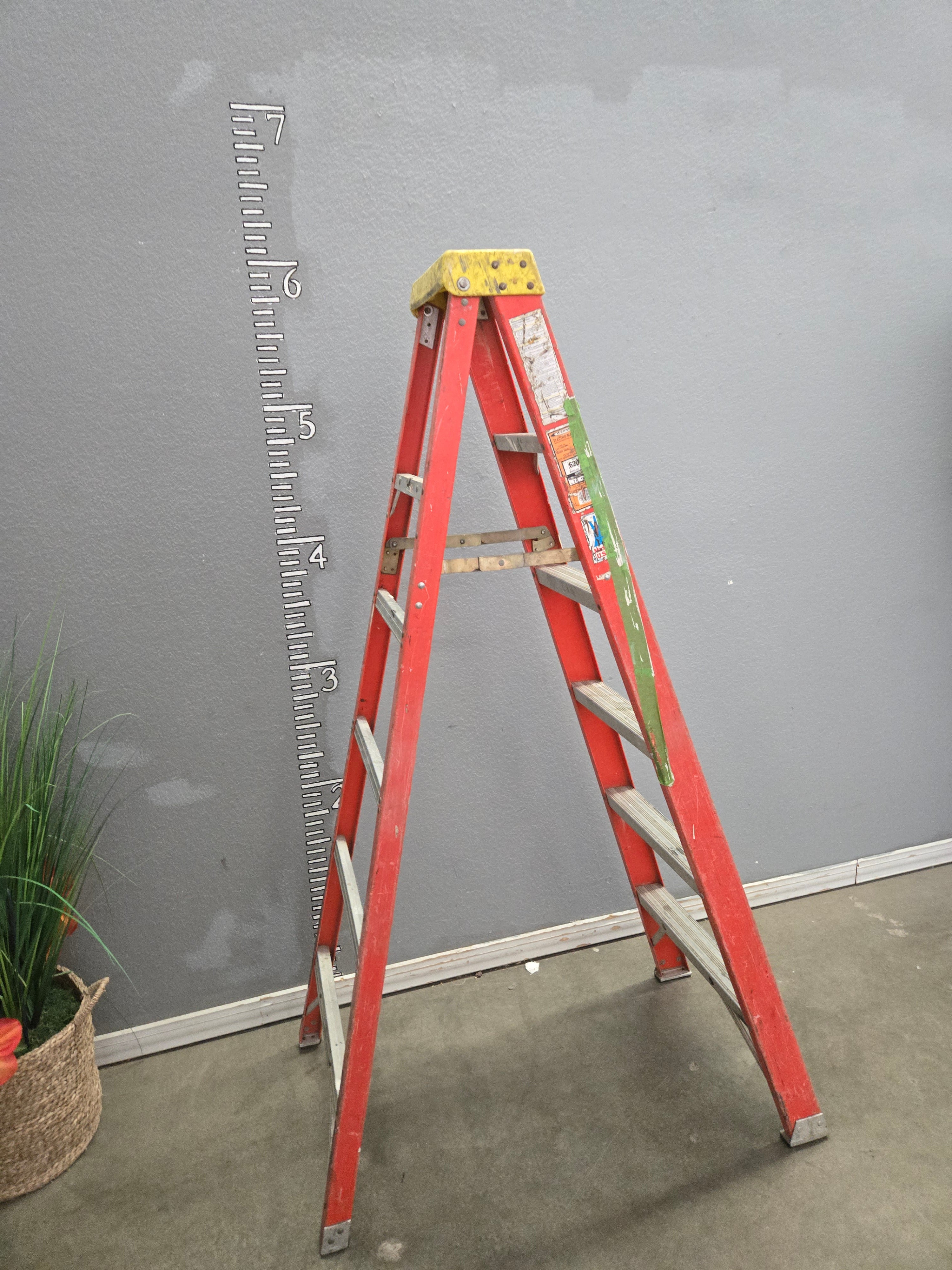 A sturdy red fiberglass step ladder with a yellow top and aluminum steps. Perfect for indoor and outdoor tasks. Approximate Size: 7 x 3 x 2
