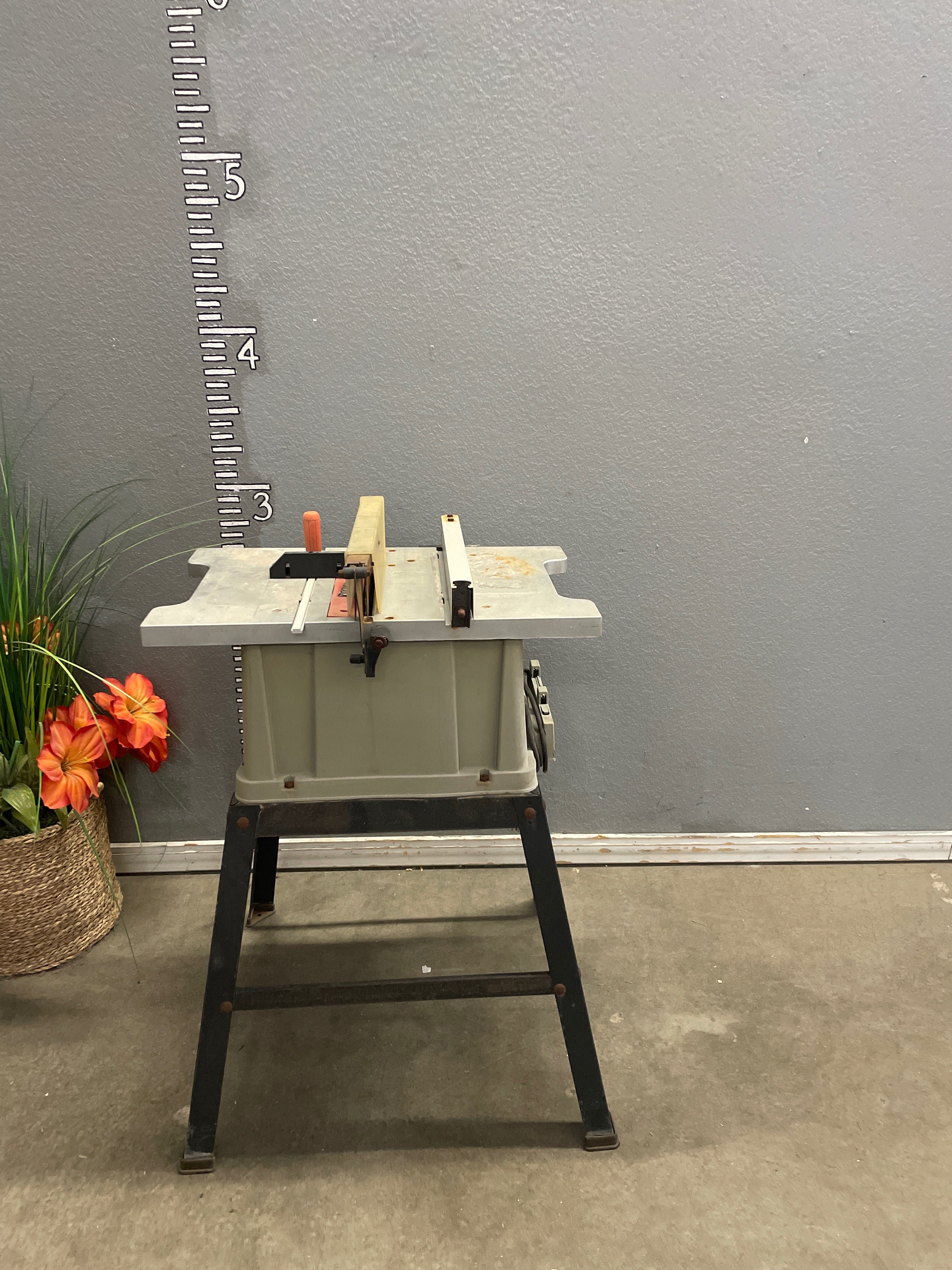 This sturdy table saw features a gray metal body with a durable finish. Designed for precision cuts, it includes a compact frame suited for small workshops or garages. Approximate Size: 3.5 x 2 x 2
