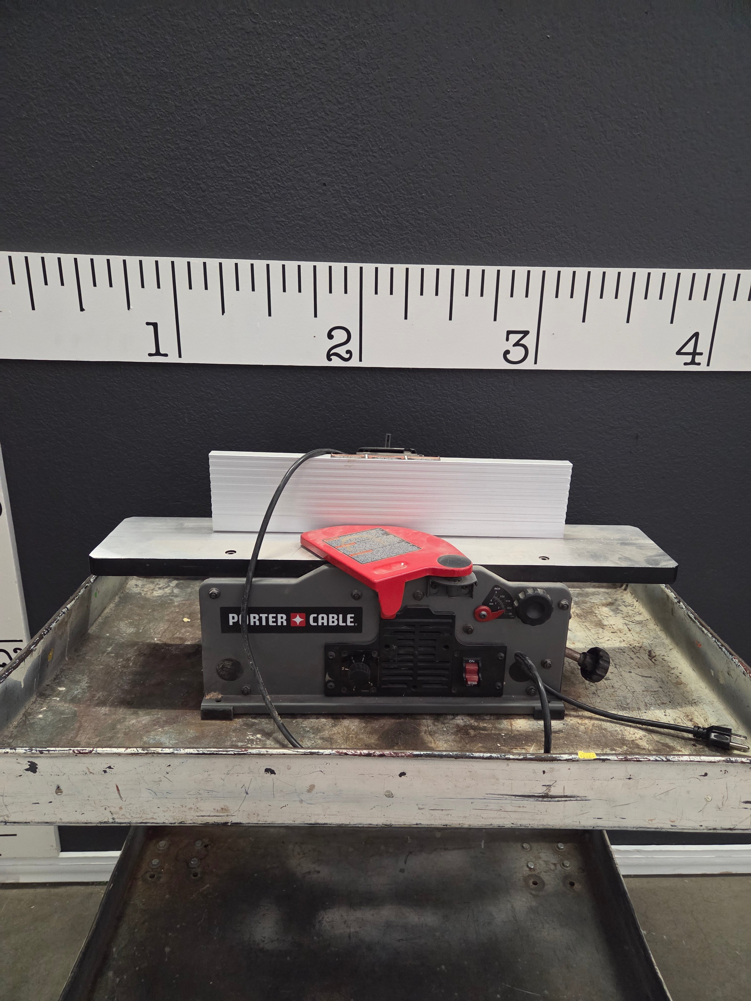 This compact tabletop jointer by Porter-Cable features a sturdy gray metal finish and a vibrant red control panel. Ideal for precision woodworking tasks. Approximate Size: 1.3 x 3 x 1