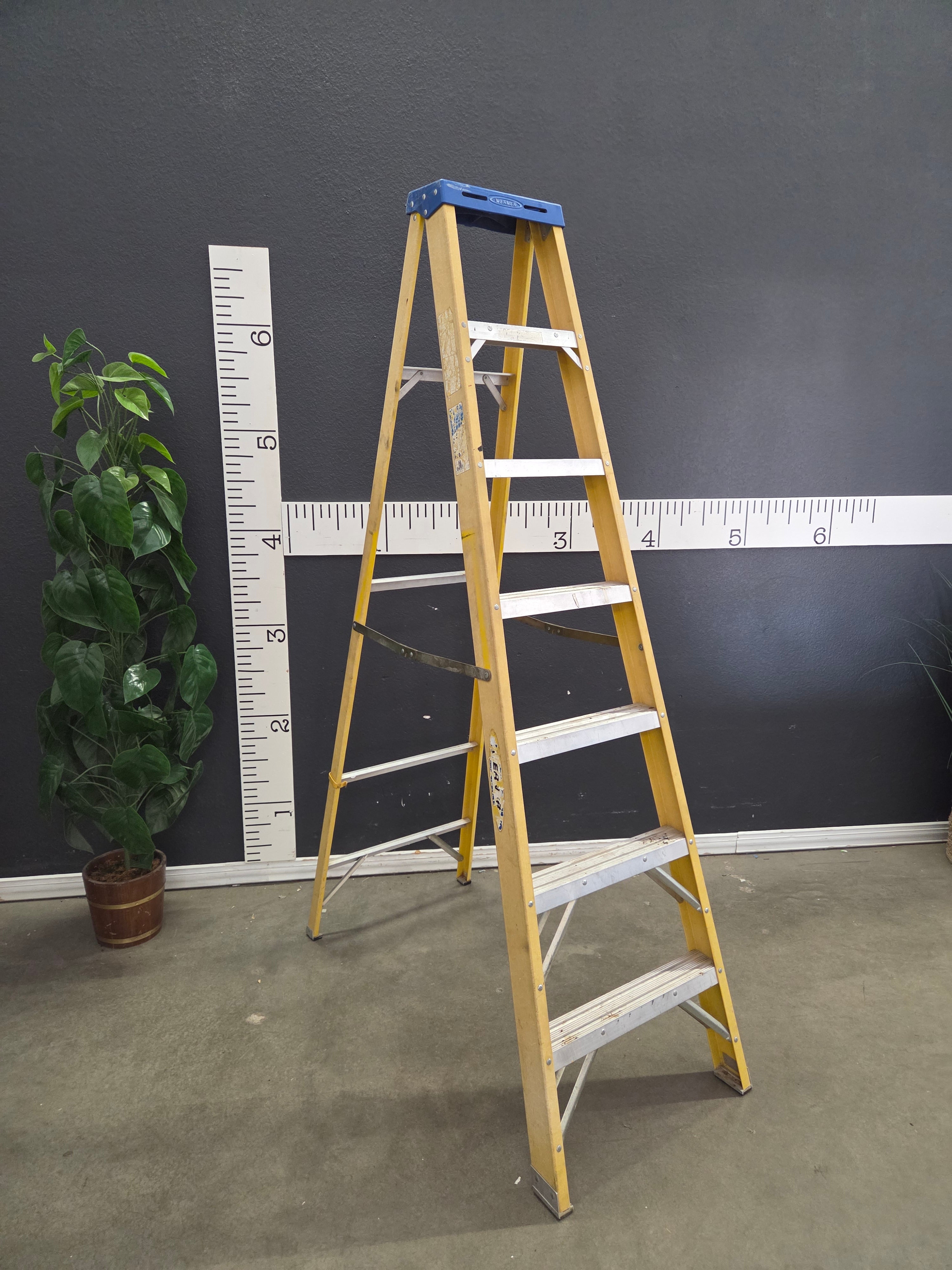 Sturdy yellow fiberglass step ladder with a blue top and metal steps, featuring a durable finish suitable for both indoor and outdoor use. Approximate Size: 6 x 2 x 2