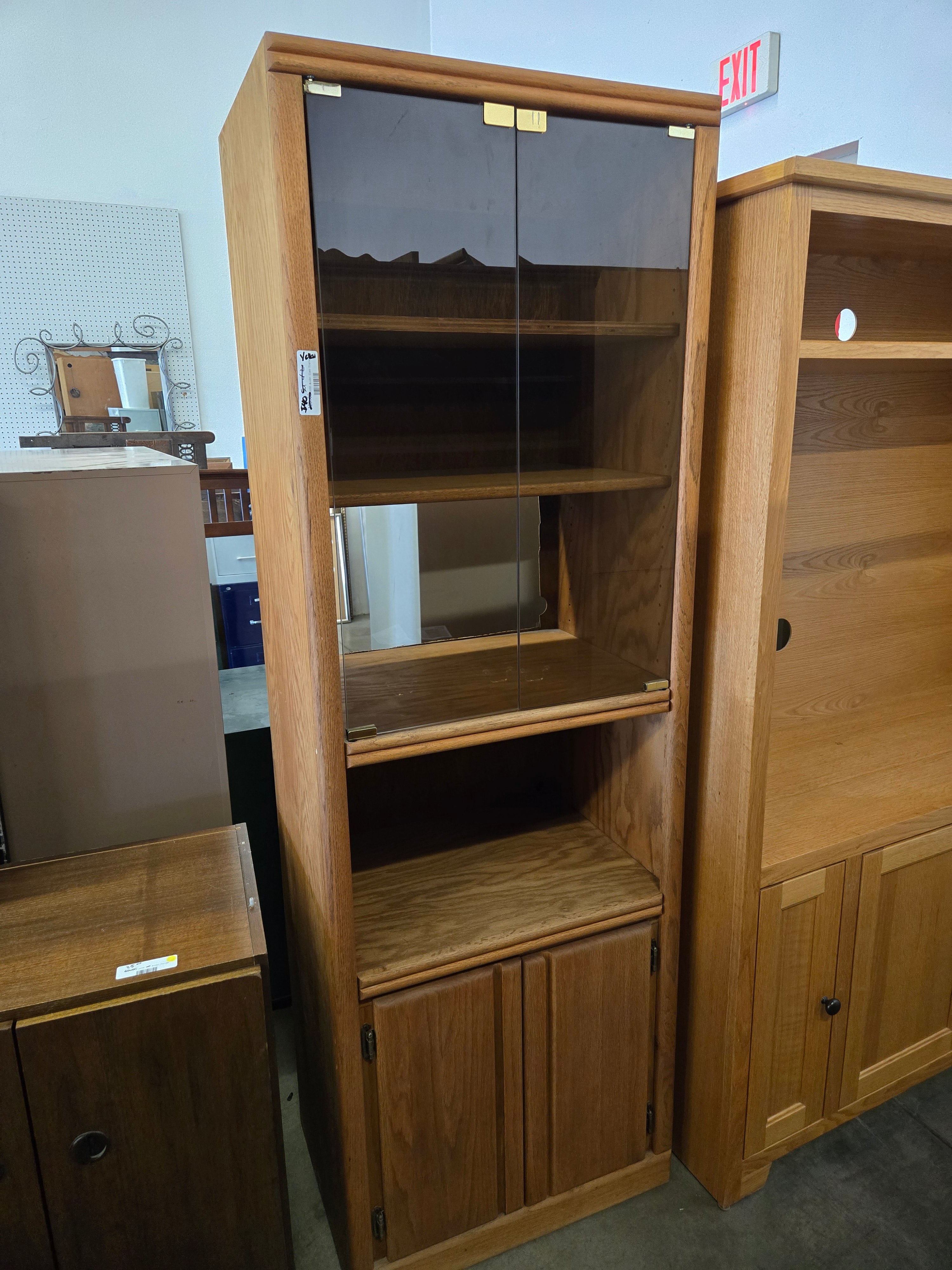 This elegant display wooden cabinet comes with a natural oak finish and glass doors, providing a sophisticated and clear view of the contents inside. Perfect for showcasing collectibles and decorative items. Approximate Size: 6 x 3 x 1