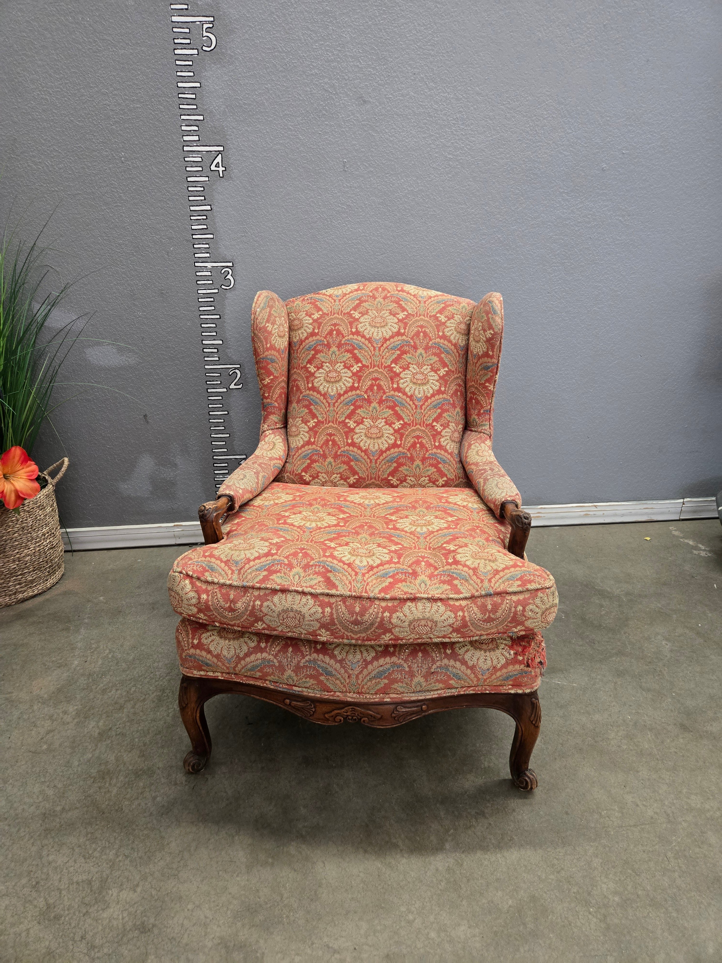 This elegant vintage wingback chair features a beautifully patterned red and gold fabric with a plush finish. The carved wooden legs add to its classic appeal. Approximate Size: 4.5 x 3 x 2.5