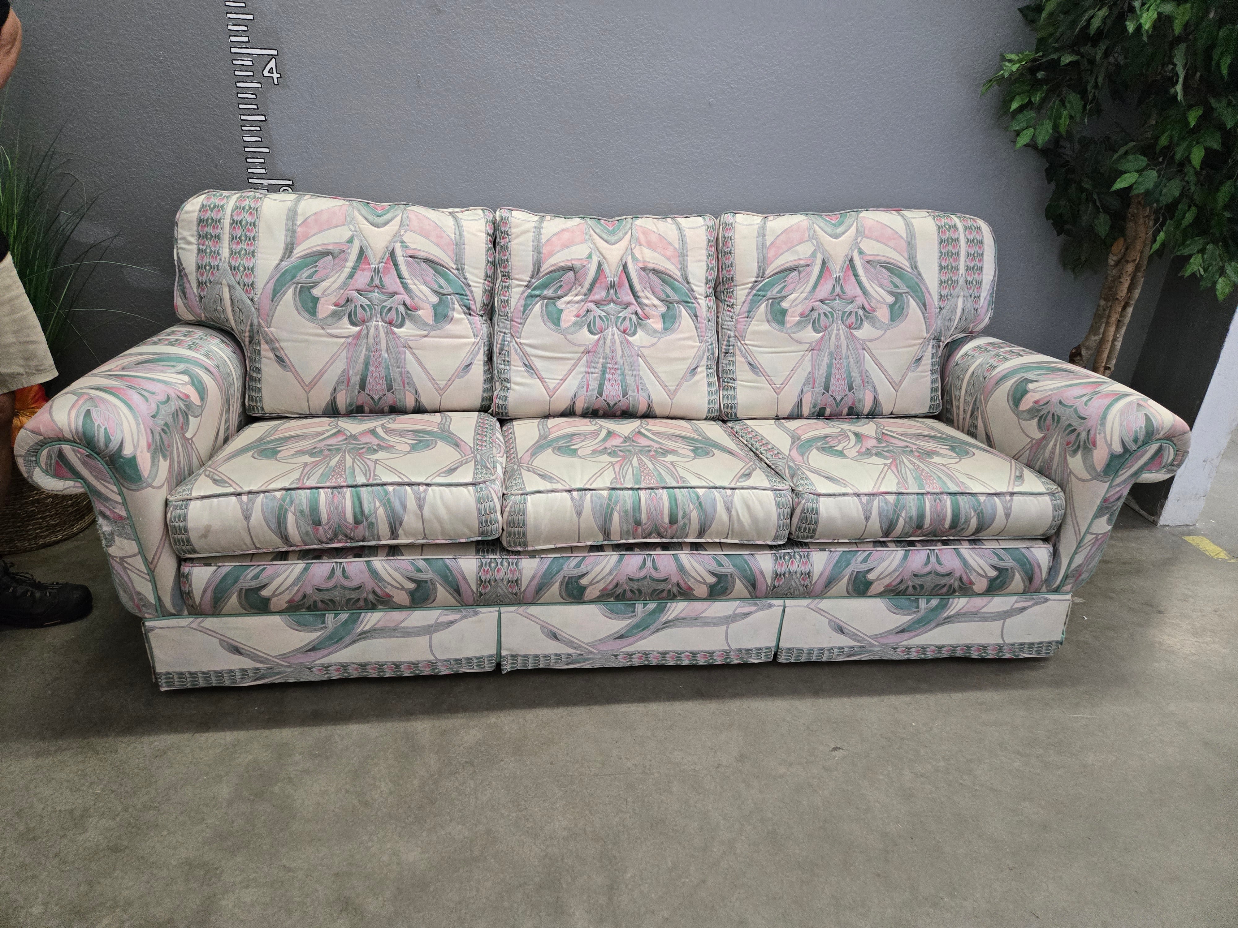 A charming vintage sofa featuring a pastel floral pattern in pink and green tones. The fabric has a matte finish with a soft, comfortable feel. Approximate Size: 2.5 x 6 x 3
