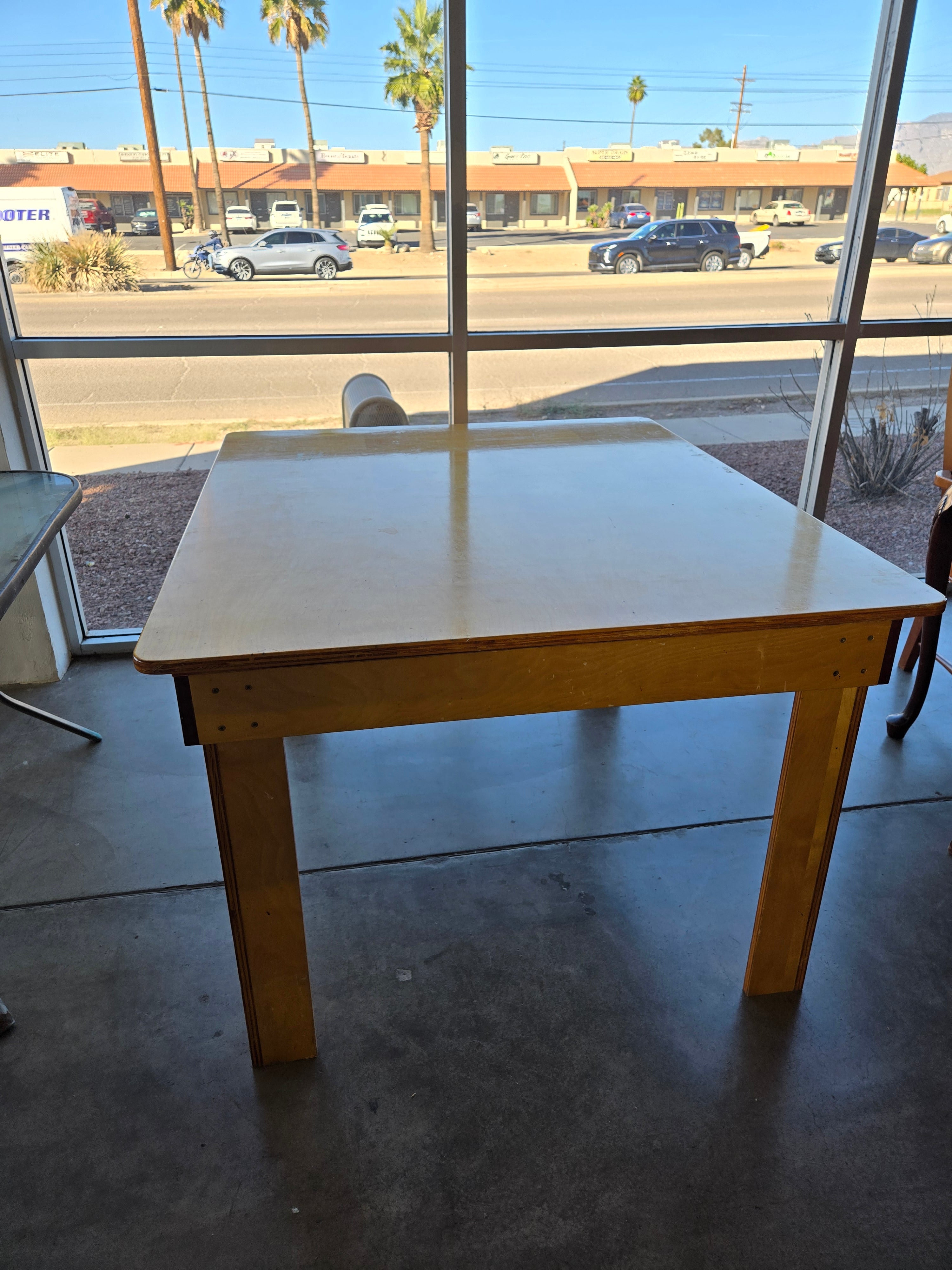 A sturdy, light brown wooden dining table with a smooth finish, perfect for a cozy dining room setting. Approximate Size: 2.5 x 4 x 4