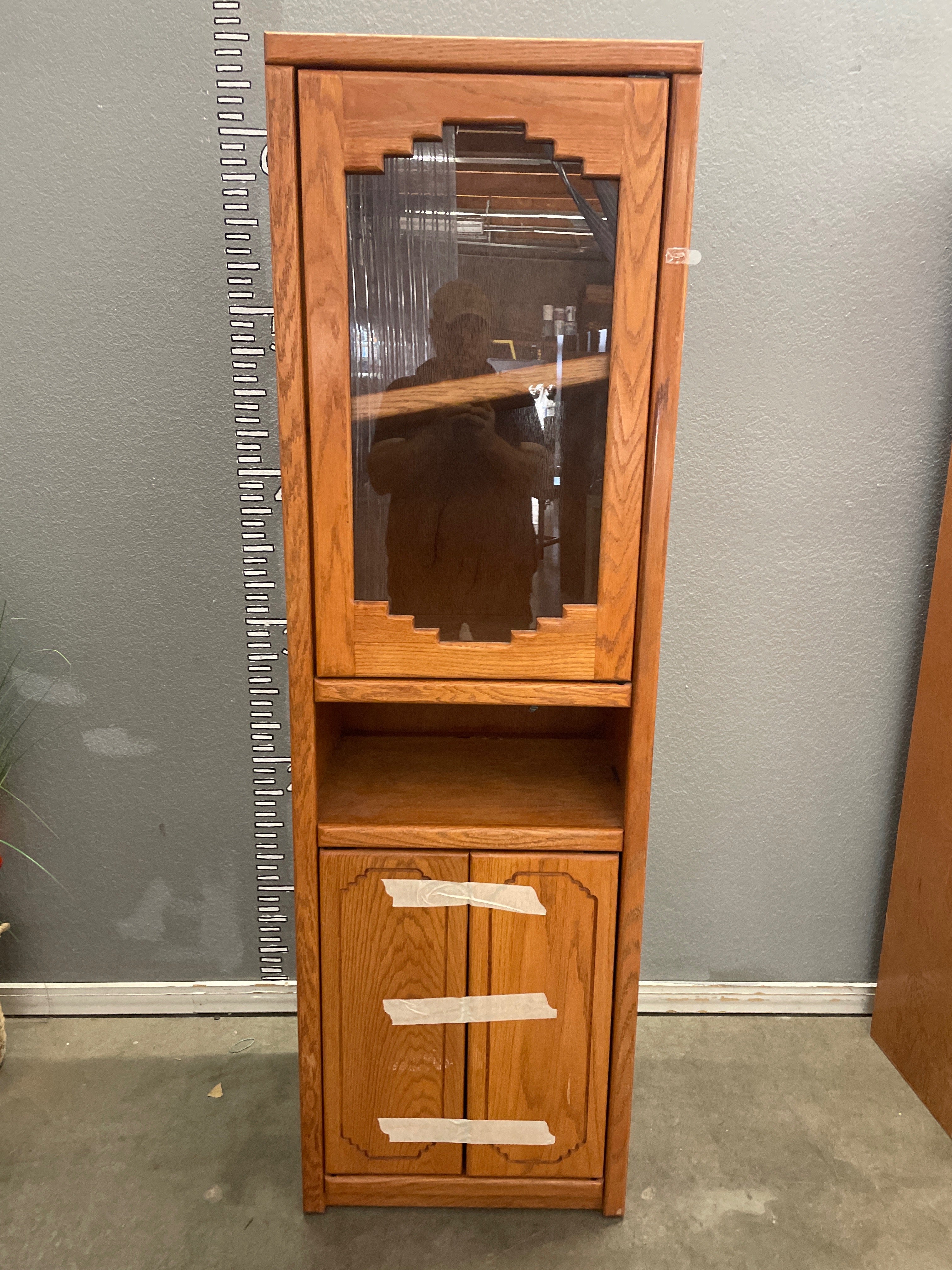 This elegant oak display cabinet comes in a warm brown finish, featuring a glass door with a decorative cutout design. Perfect for showcasing collectibles or fine china. The sturdy wood construction provides durability and sophistication. Approximate Size: 6 x 2 x 1