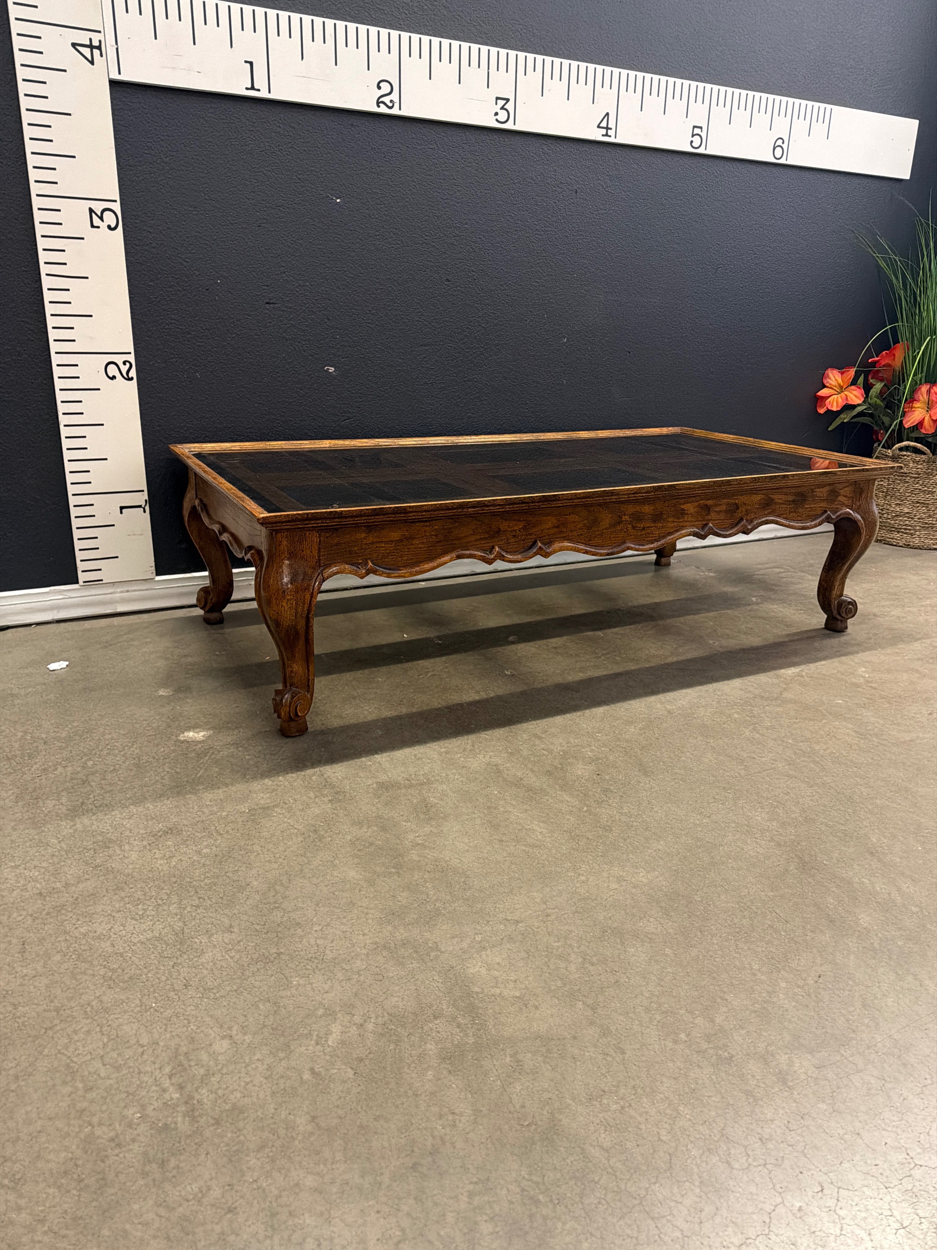 A classic vintage wooden coffee table featuring a rich brown finish and an elegant glass top. The table's ornate legs and carved details add a touch of sophistication to any living room decor. Approximate Size: 1.5 x 4 x 2