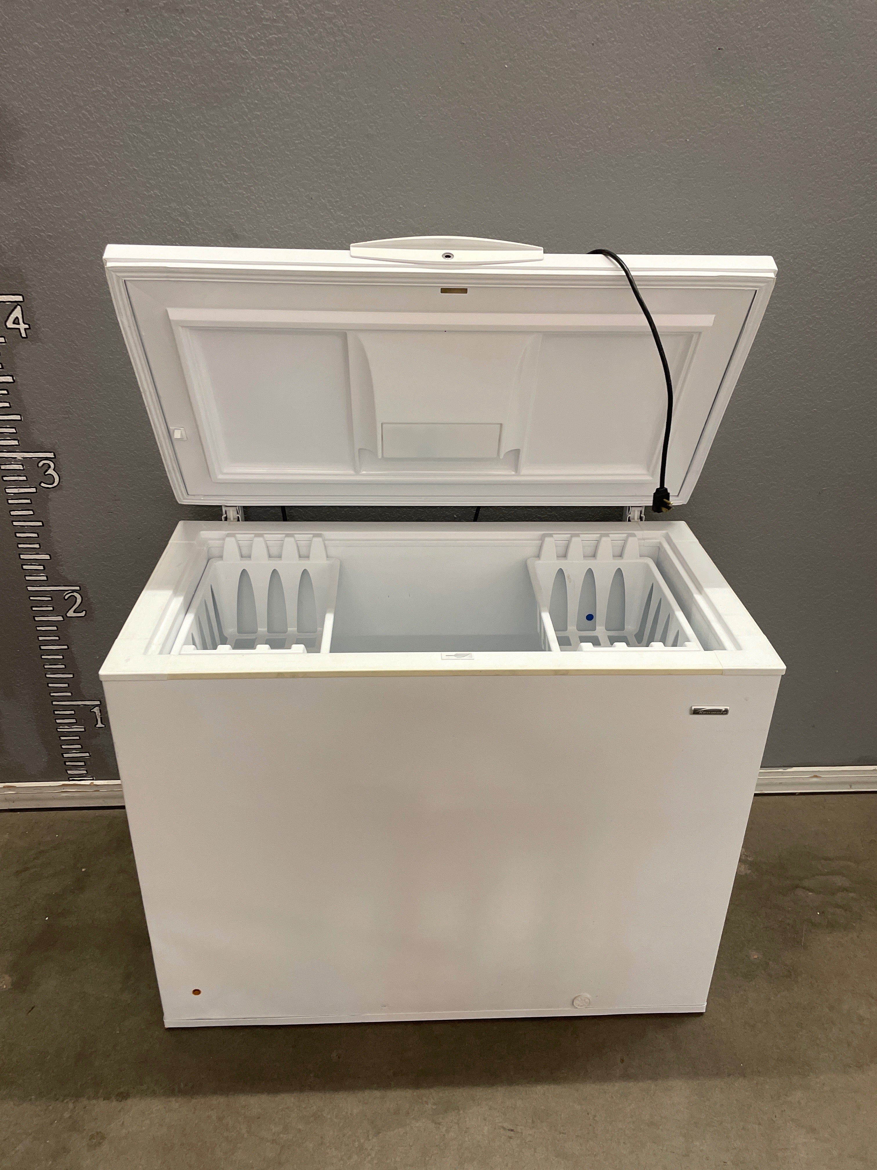 This spacious white chest freezer features a sleek matte finish and comes with convenient basket storage inside. Perfect for keeping your frozen goods organized and accessible. Approximate Size: 3 x 4 x 2