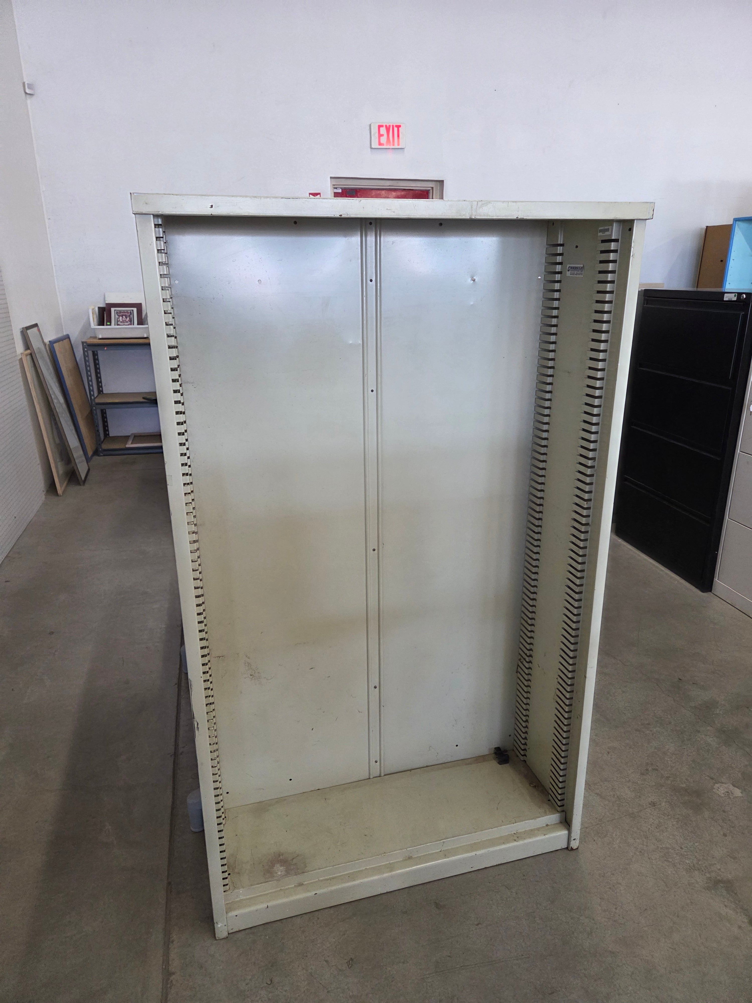 This vintage metal storage cabinet features a durable beige finish. Perfect for organizing a variety of items in industrial or office settings. Approximate Size: 6 x 3 x 2