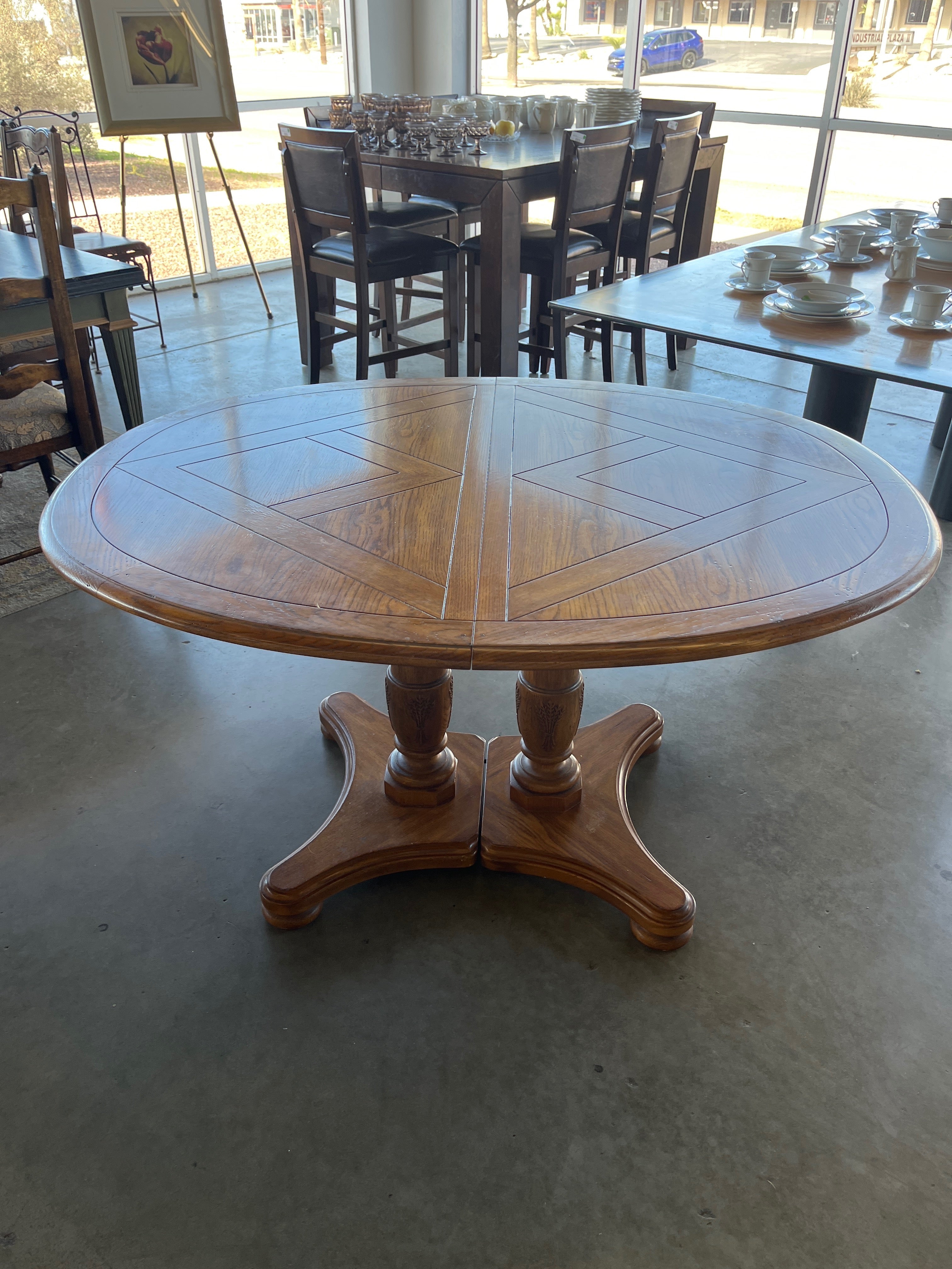 This elegant dining table features an oval top with a warm wood finish and intricate geometric patterns. The sturdy pedestal base adds a touch of traditional charm, making it a perfect centerpiece for any dining room. Approximate Size: 2.5 x 6 x 4