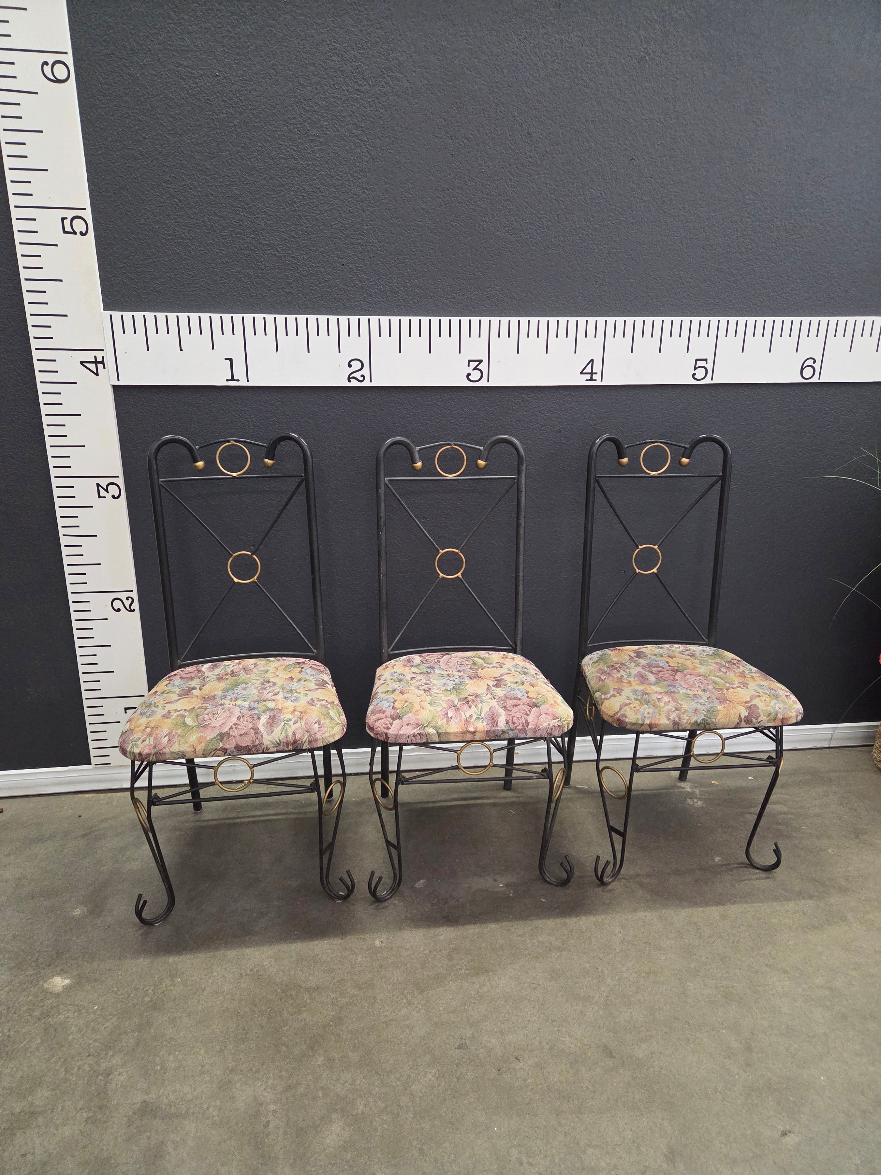 These charming vintage chairs feature a sturdy metal frame with a rustic black finish. The seats are cushioned with a floral fabric that blends pastel shades of pink, green, and beige, offering a touch of vintage elegance. Approximate Size: 3 x 1.5 x 1.5