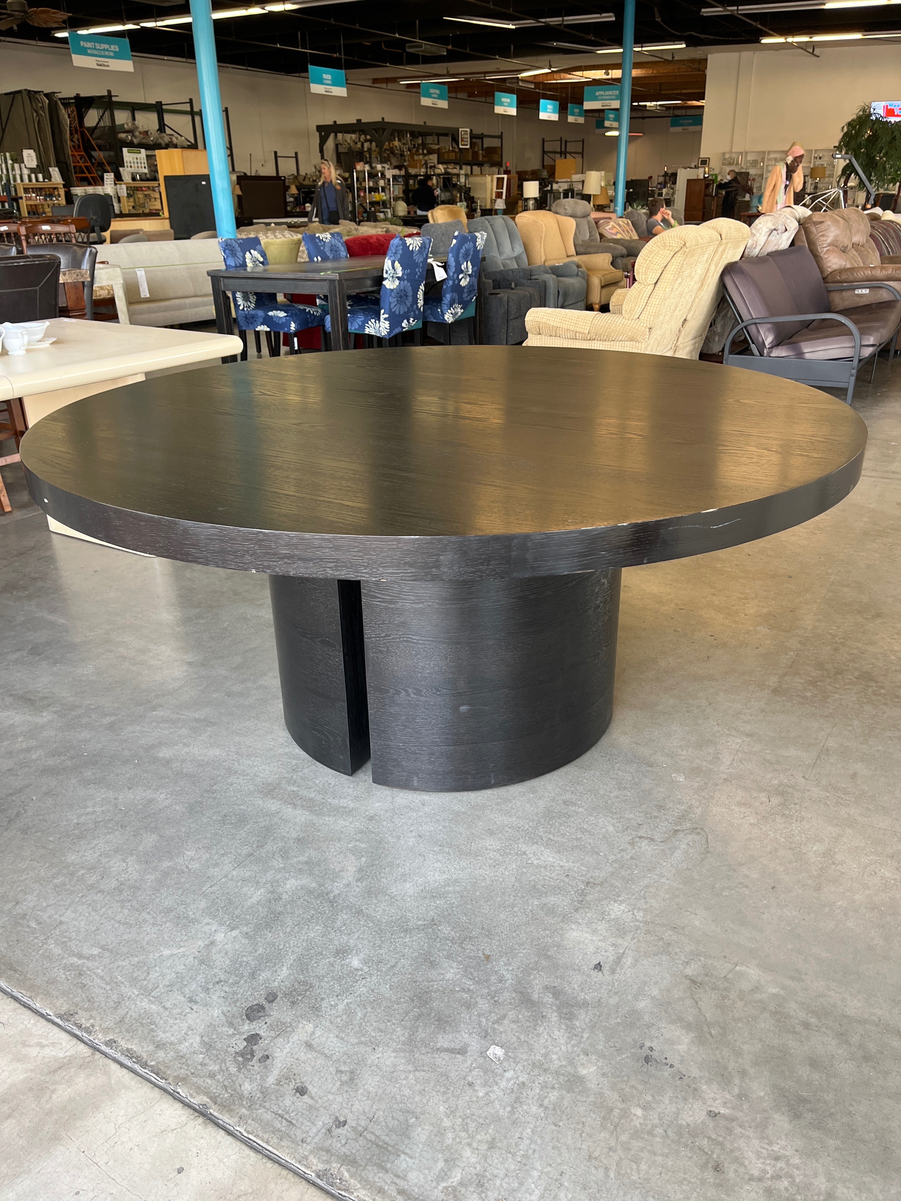 This elegant dining table features a rich black finish with a smooth wood texture. Perfect for a contemporary dining room setup, it offers a sturdy and stylish centerpiece for gatherings. Approximate Size: 3 x 5 x 5