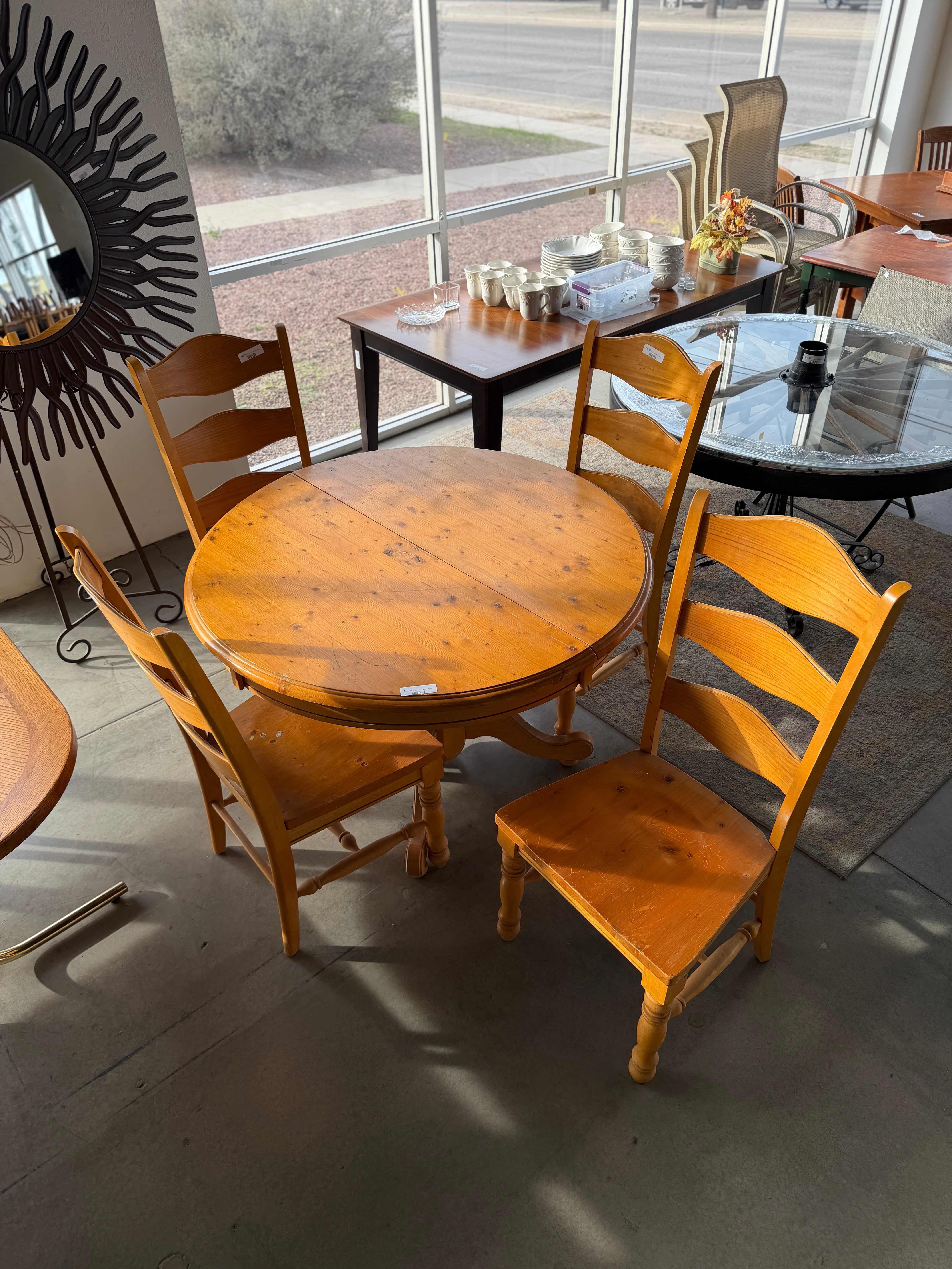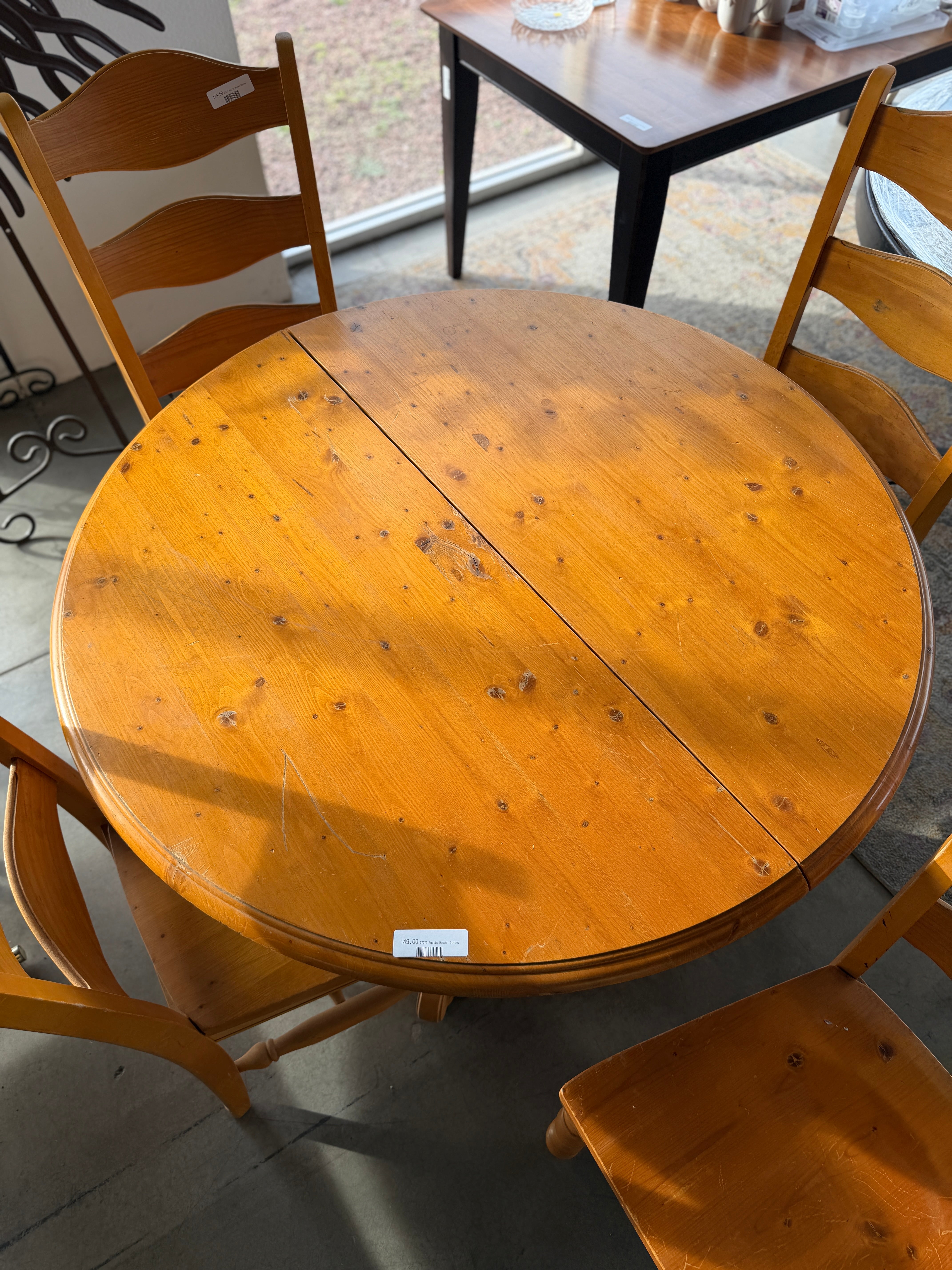 This charming rustic wooden dining set features a round table and four matching chairs, crafted with a warm honey finish. The natural wood grain provides a classic and inviting look, perfect for any dining room. Approximate Size: 2.5 x 4 x 4