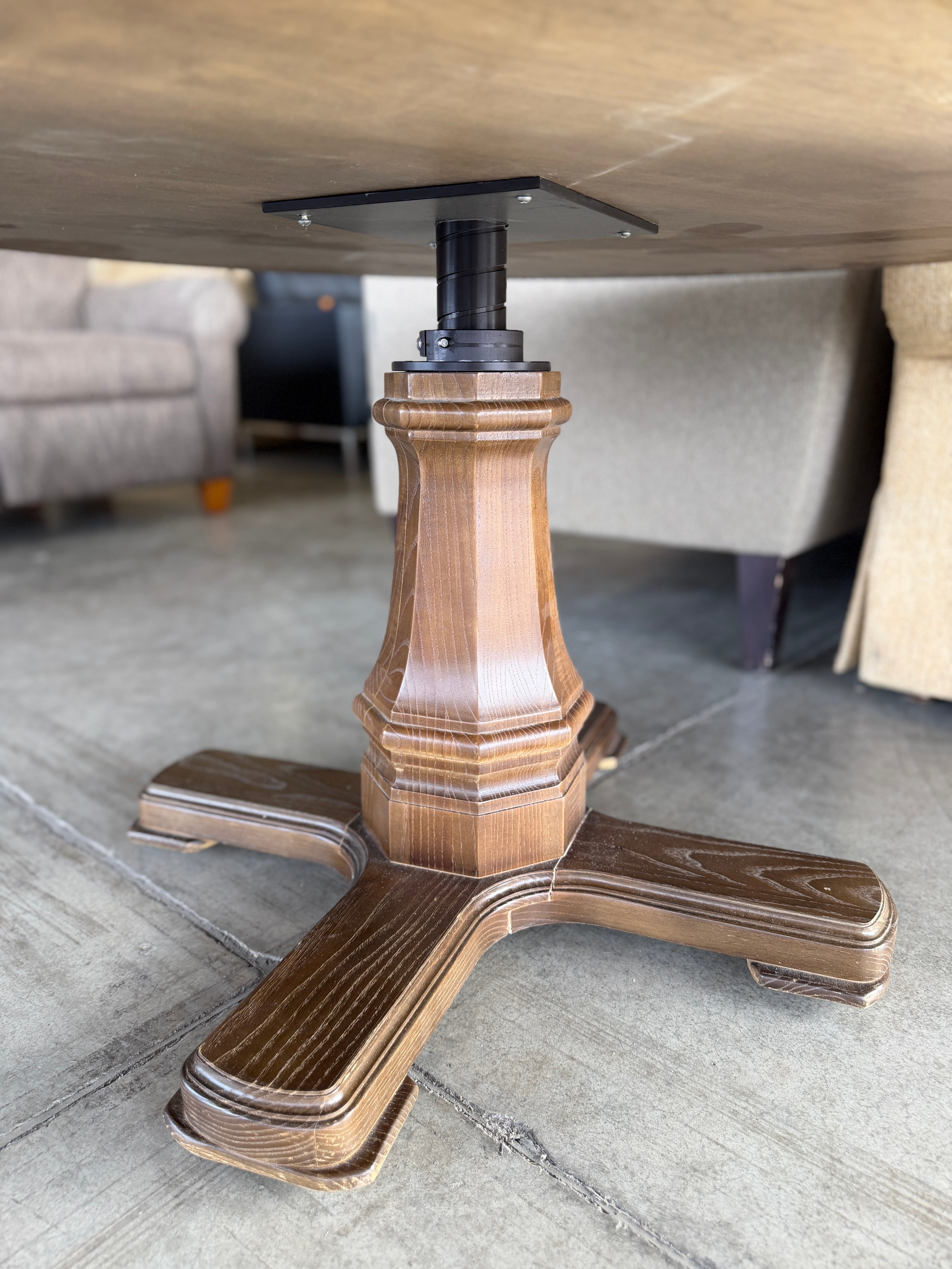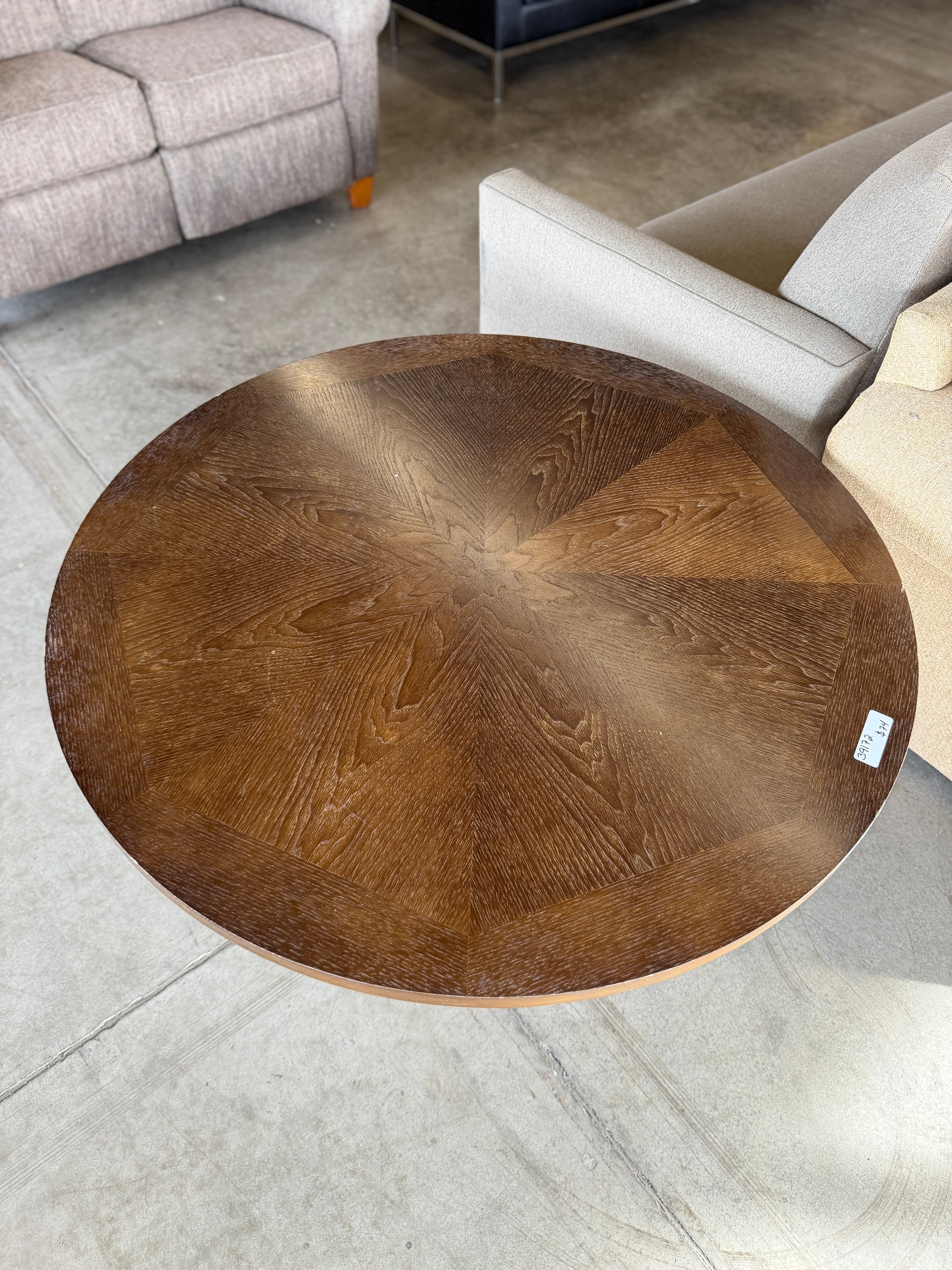 This vintage round table features a rich dark brown wood finish with a sturdy pedestal base, ideal for adding a touch of classic charm to any space. Approximate Size: 2.5 x 3 x 3