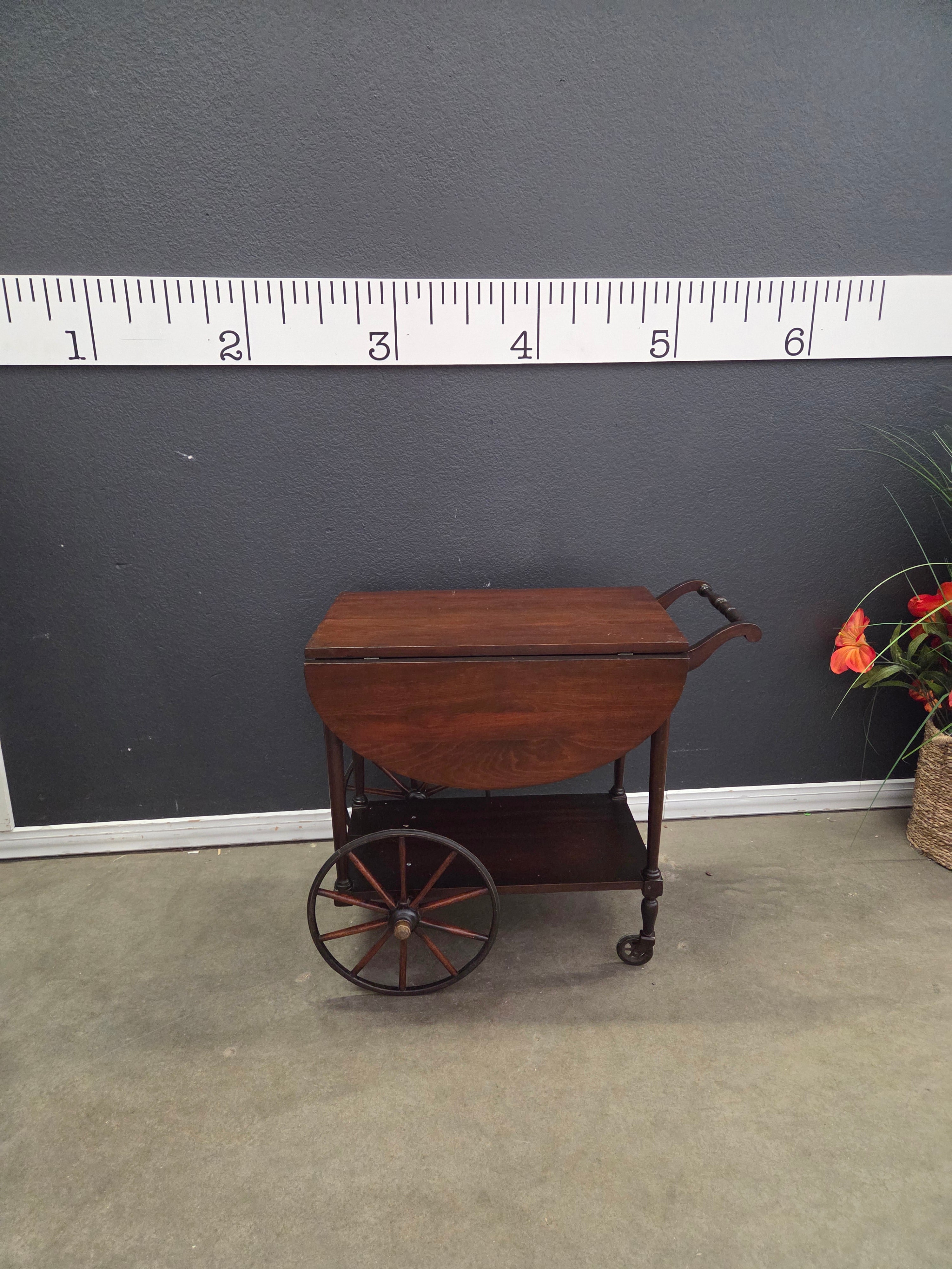 This vintage tea cart features a rich brown wooden finish, crafted with elegant drop-leaf sides and smooth rolling wheels, ideal for serving and storage. Approximate Size: 3 x 2 x 1.5