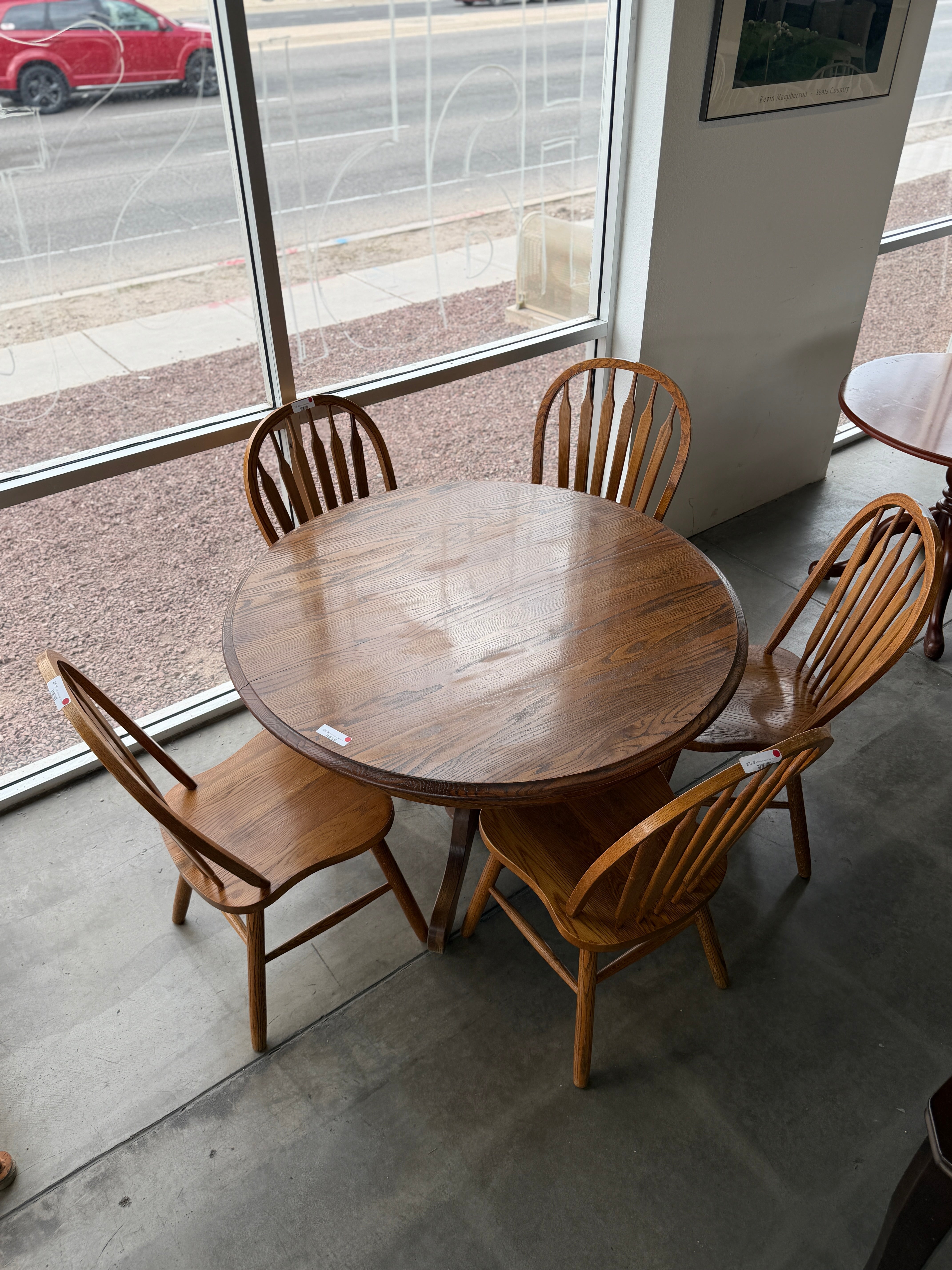 This elegant dining set features a round oak table with a rich, natural wood finish. It comes with four matching chairs, each crafted from the same durable oak material. The set's timeless design will complement any dining area. Approximate Size: 2.5 x 4 x 4