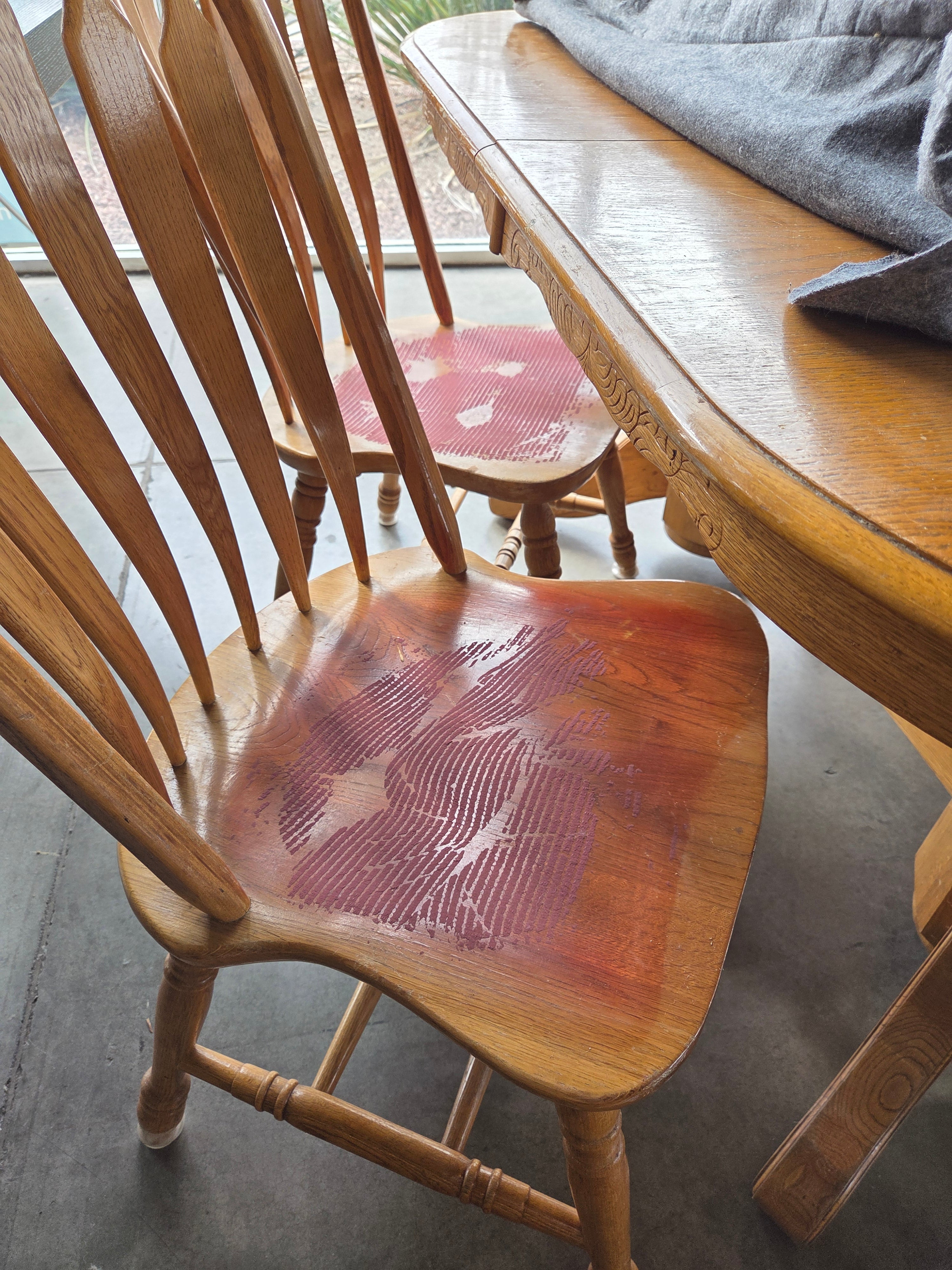 This charming dining set features a classic wooden table with a natural oak finish, paired with five matching chairs. The set's warm tones and traditional design make it perfect for creating a welcoming dining area. Approximate Size: 2.5 x 5 x 3