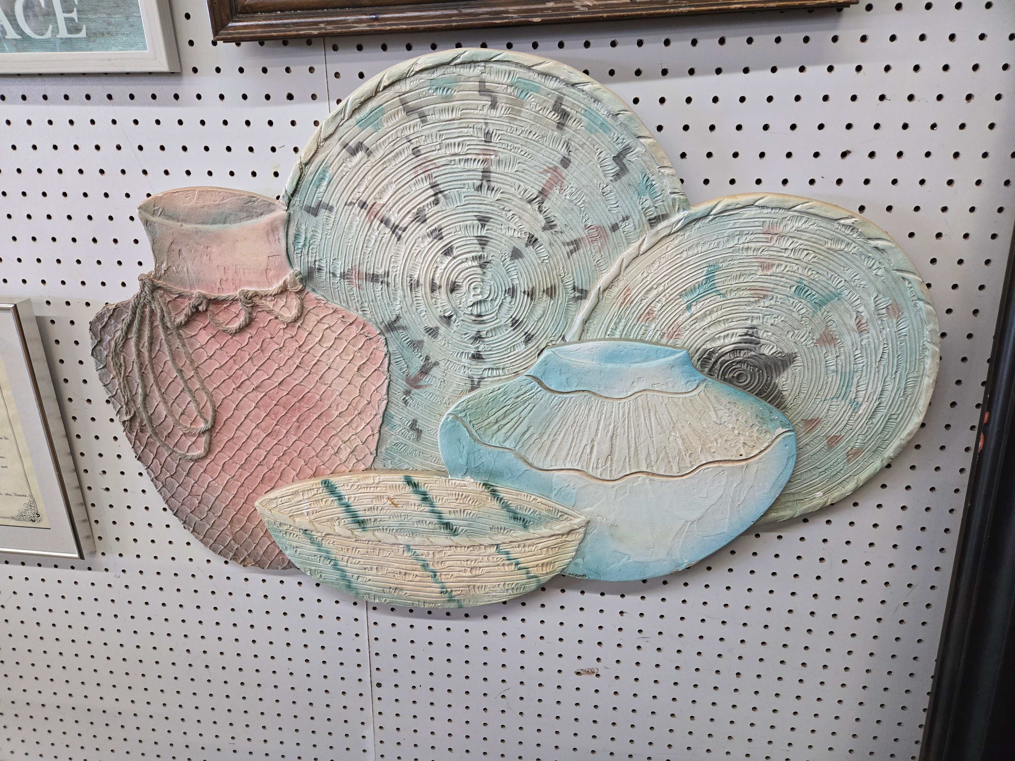 This unique wall art piece features a collection of textured vases and baskets in soft pastels of pink and blue with a rustic finish. Crafted to add a touch of elegance and artistic flair, it's perfect for enhancing any room's décor. Approximate Size: 2 x 3 x 0.1