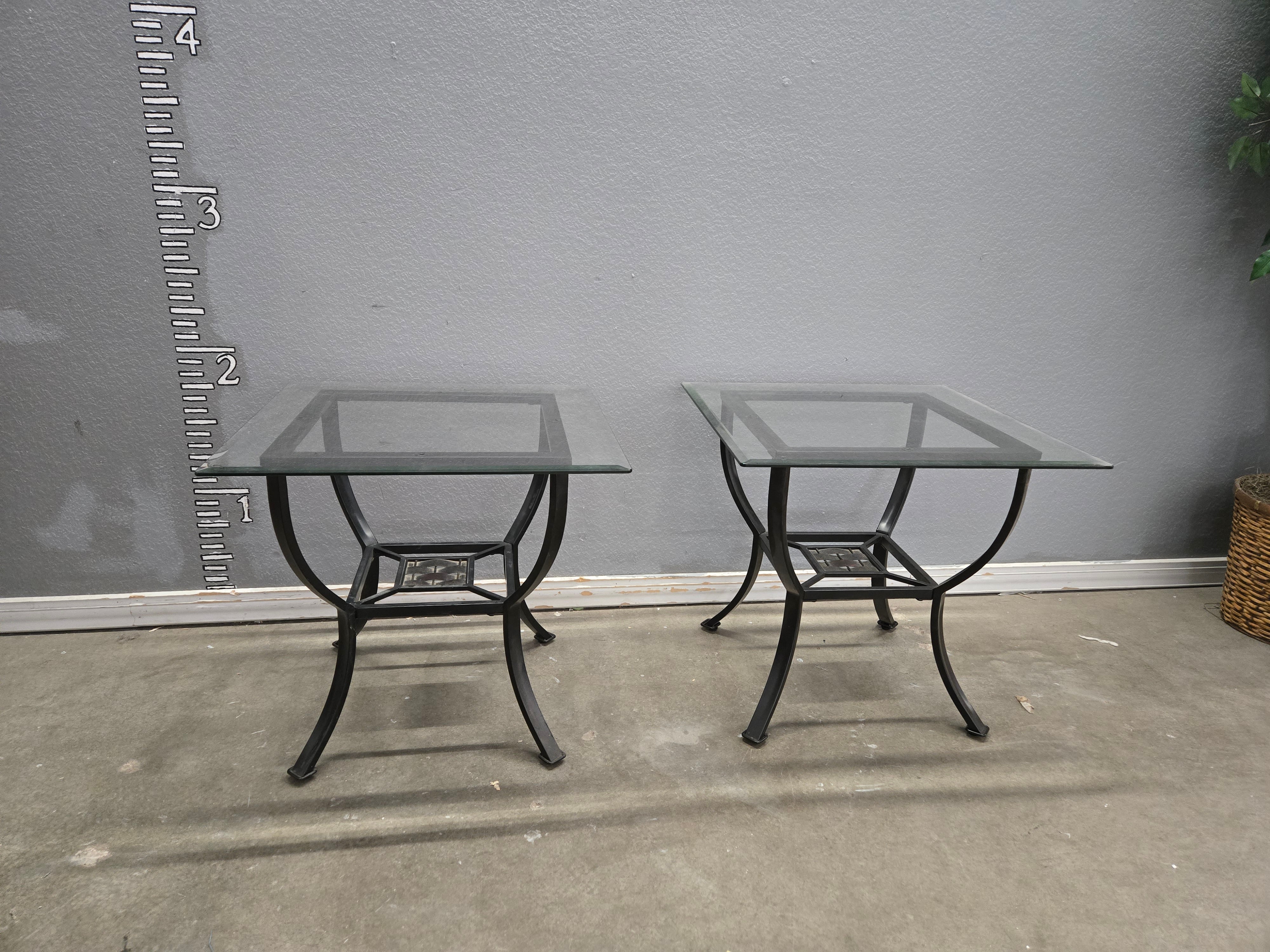 Set of elegant side tables with a sleek glass top and sturdy black metal frame. The tables feature a minimalist design with a smooth finish, perfect for adding a contemporary touch to any space. Approximate Size: 1.5 x 1.5 x 1.5