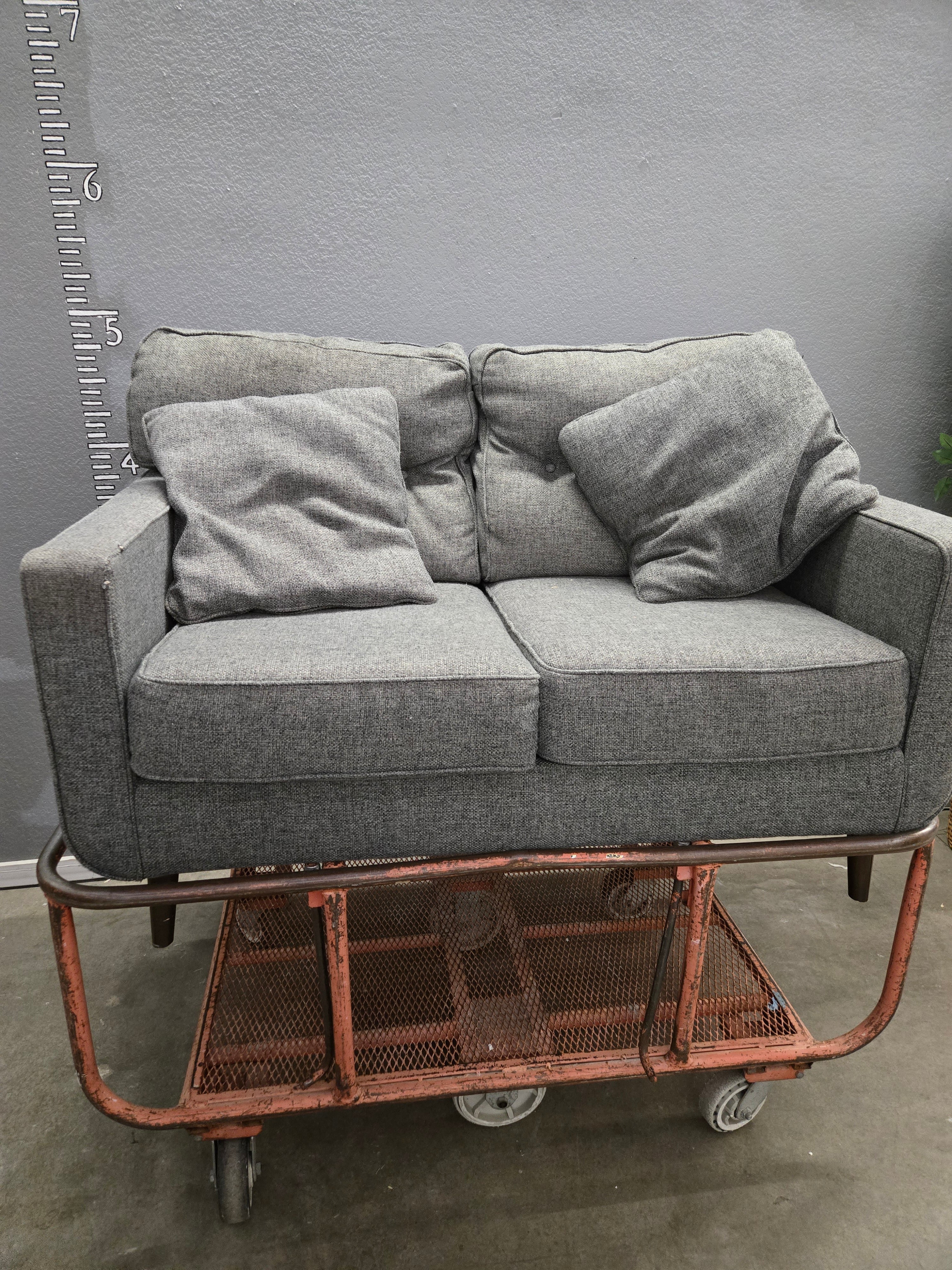 This stylish loveseat features a sleek gray fabric with a smooth finish, perfect for modern living room spaces. Comfortable cushioning and supportive armrests make it a versatile addition to any home. Approximate Size: 2.5 x 4.5 x 2.5