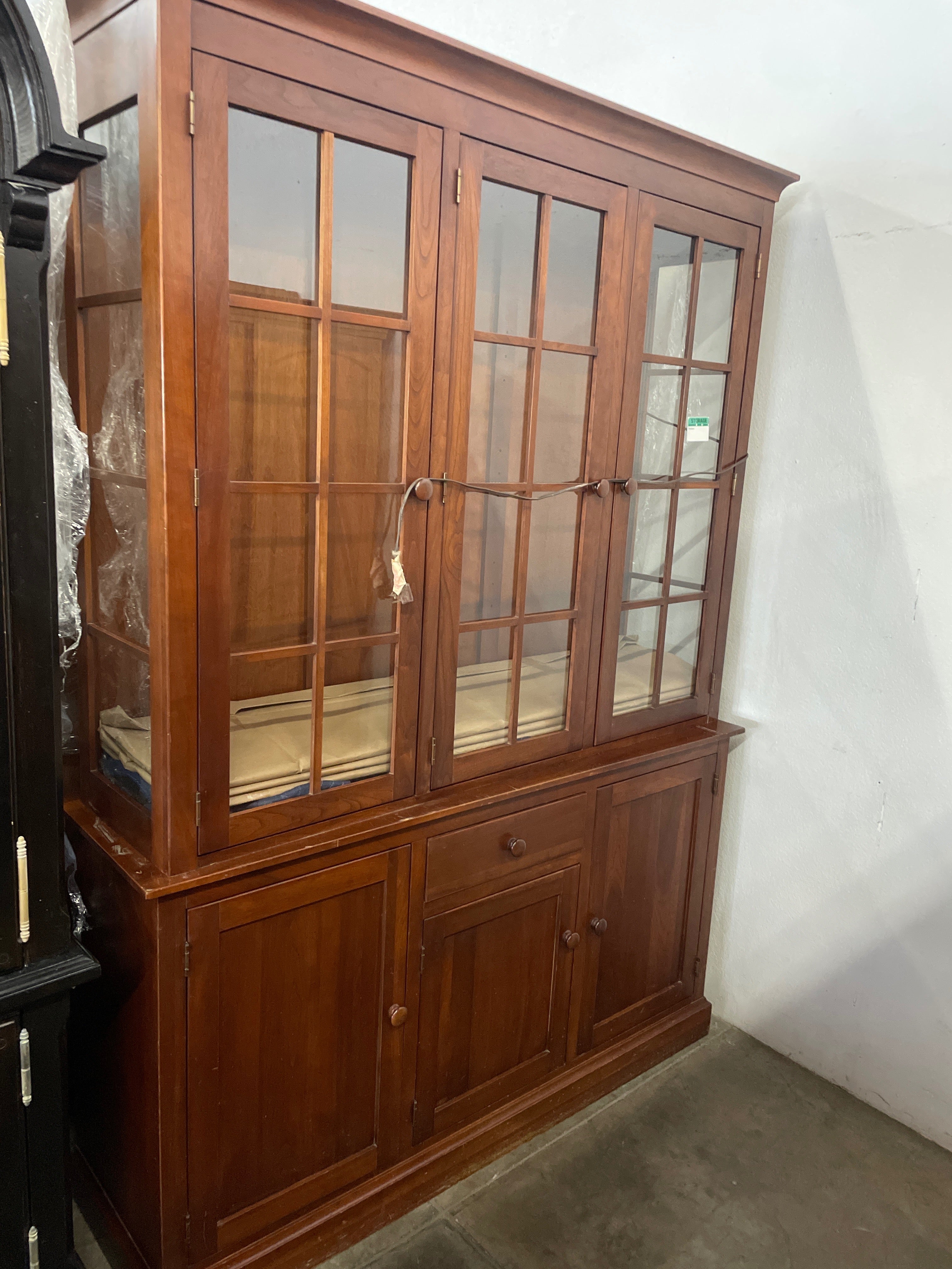 This elegant display cabinet features a rich, warm brown finish and clear glass doors with wooden framing. The cabinet's traditional design is perfect for showcasing fine china or collectibles. The solid wood construction ensures durability and timeless style. Approximate Size: 7 x 5 x 1.5
