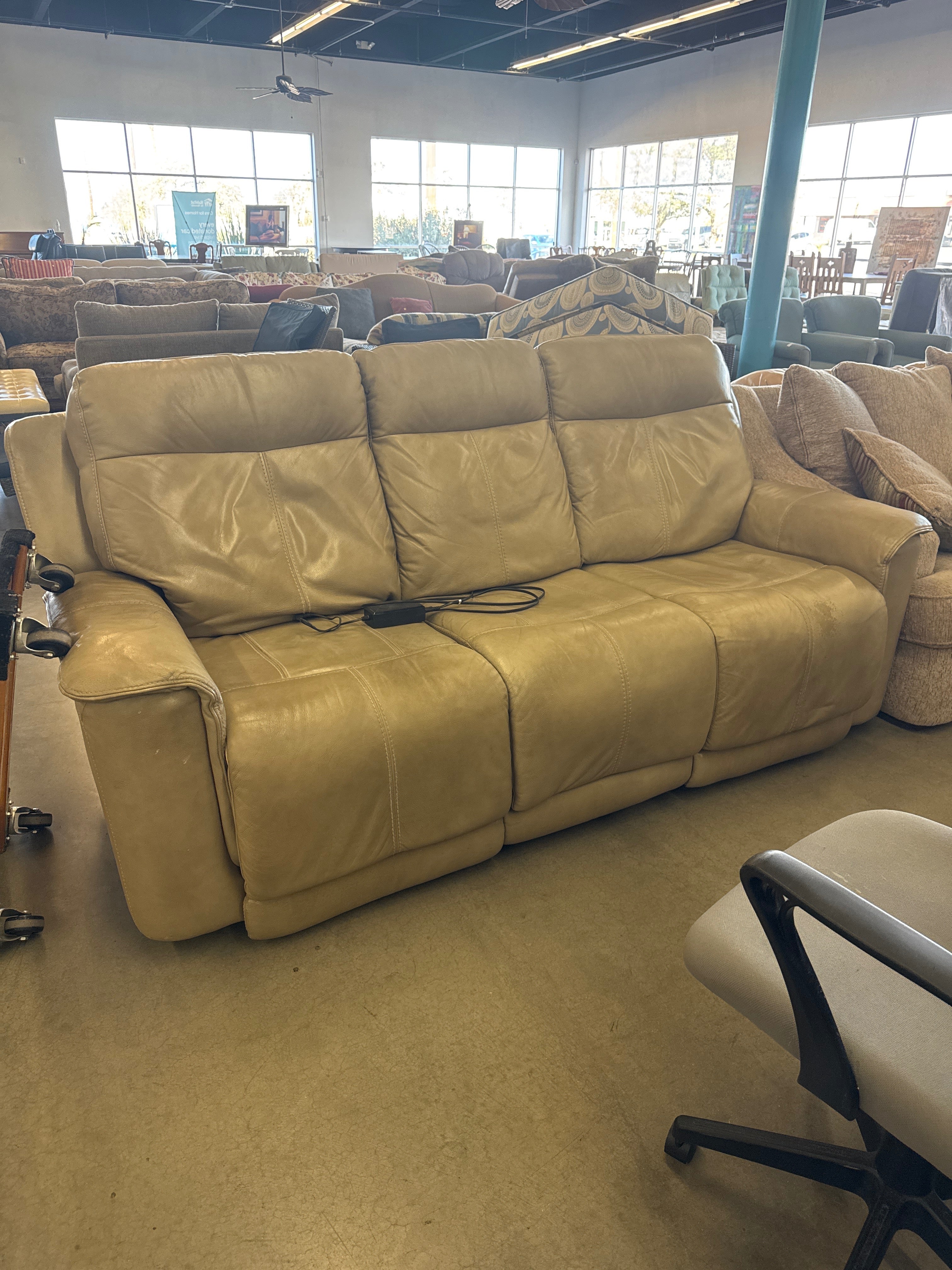 A comfortable three-seater reclining sofa in a beige leather finish. Approximate Size: 3 x 6.5 x 3