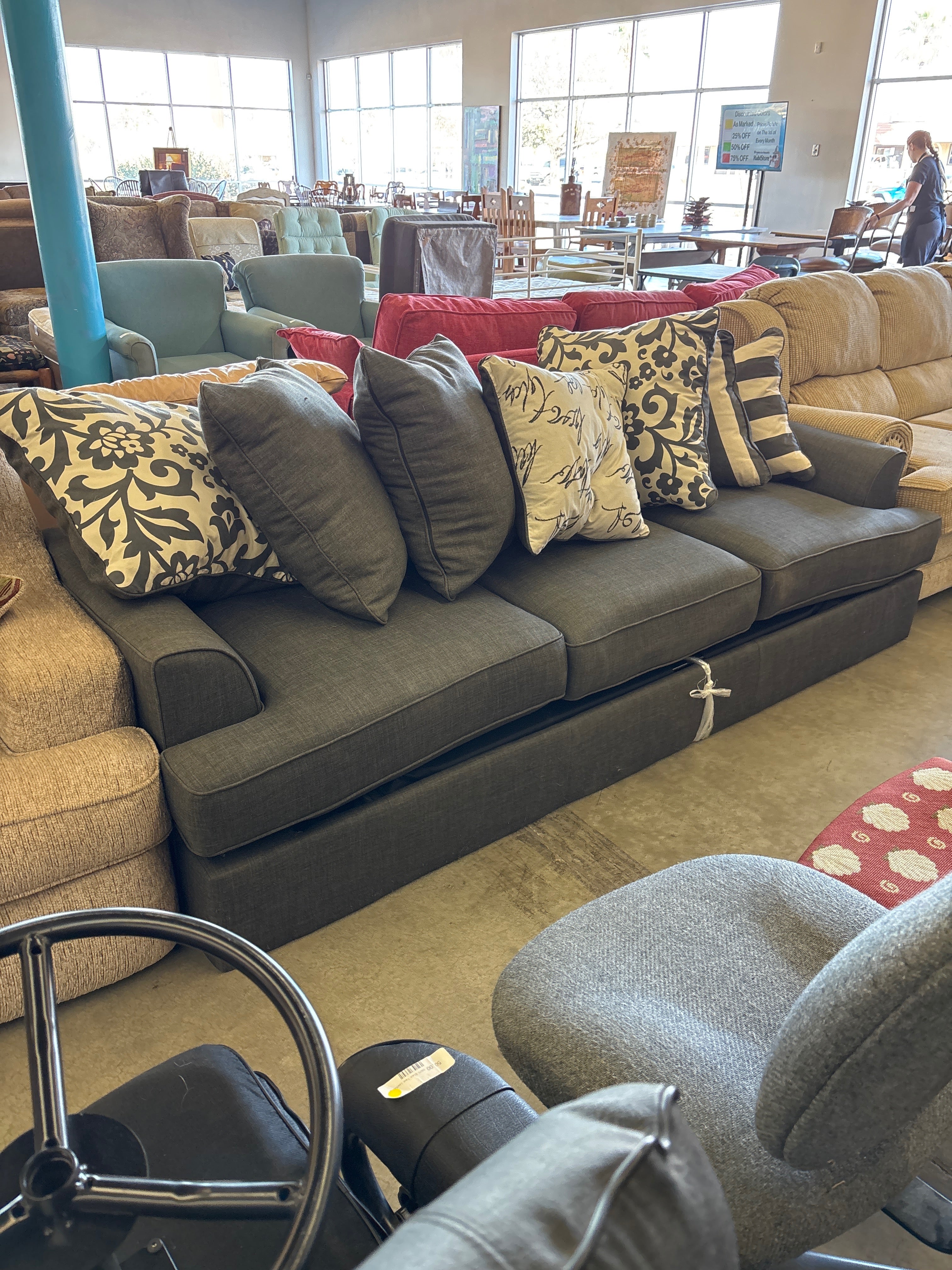 A stylish and comfortable three-seater sofa featuring a dark gray fabric finish. The sofa is accented with a set of patterned cushions in muted tones, offering both style and comfort, perfect for a modern living room setting. Approximate Size: 3 x 7 x 3