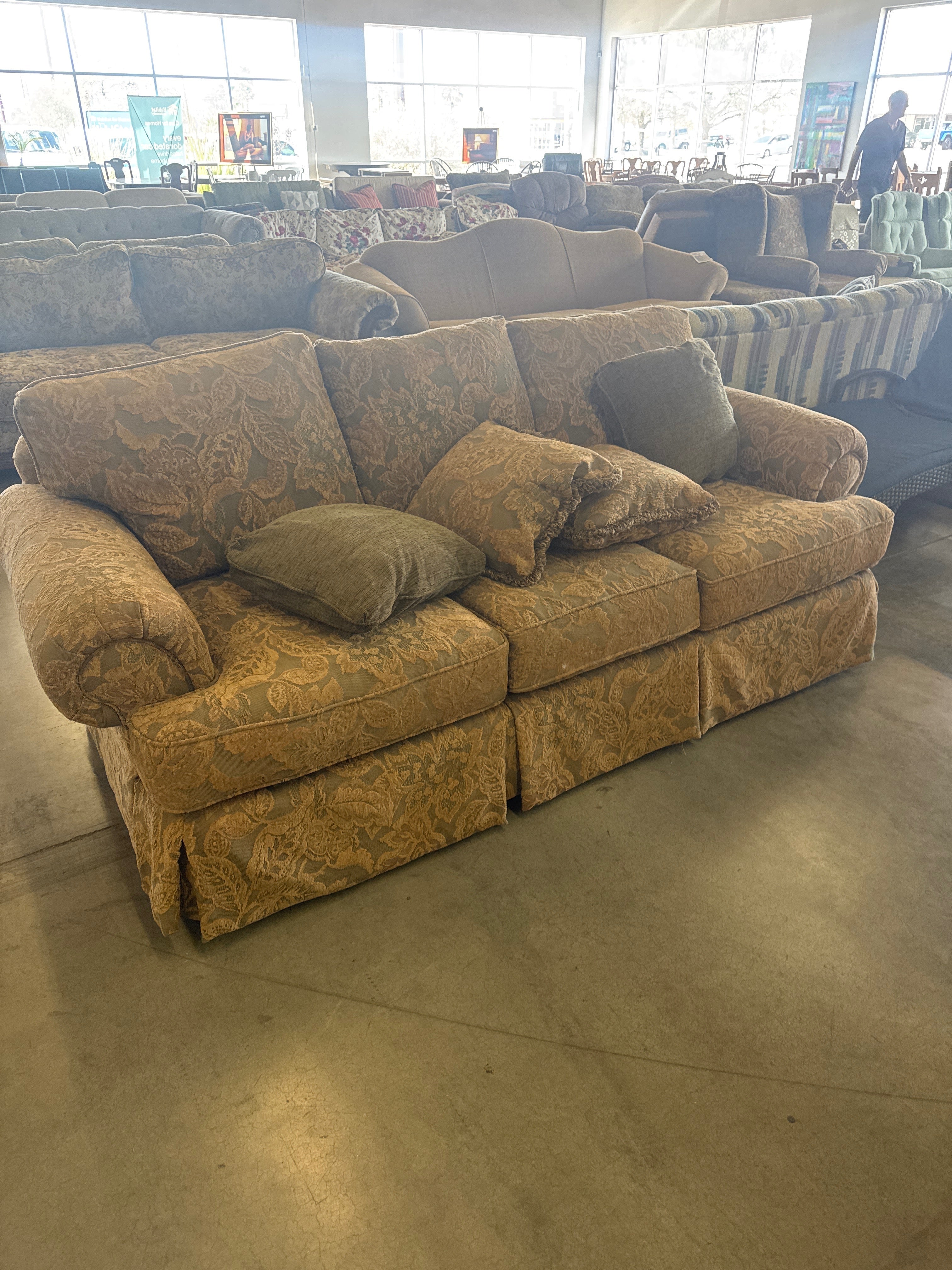 Elegant sofa with a classic floral pattern upholstery in muted beige tones, featuring a comfortable, fabric finish perfect for a cozy living space. Approximate Size: 3 x 6 x 3