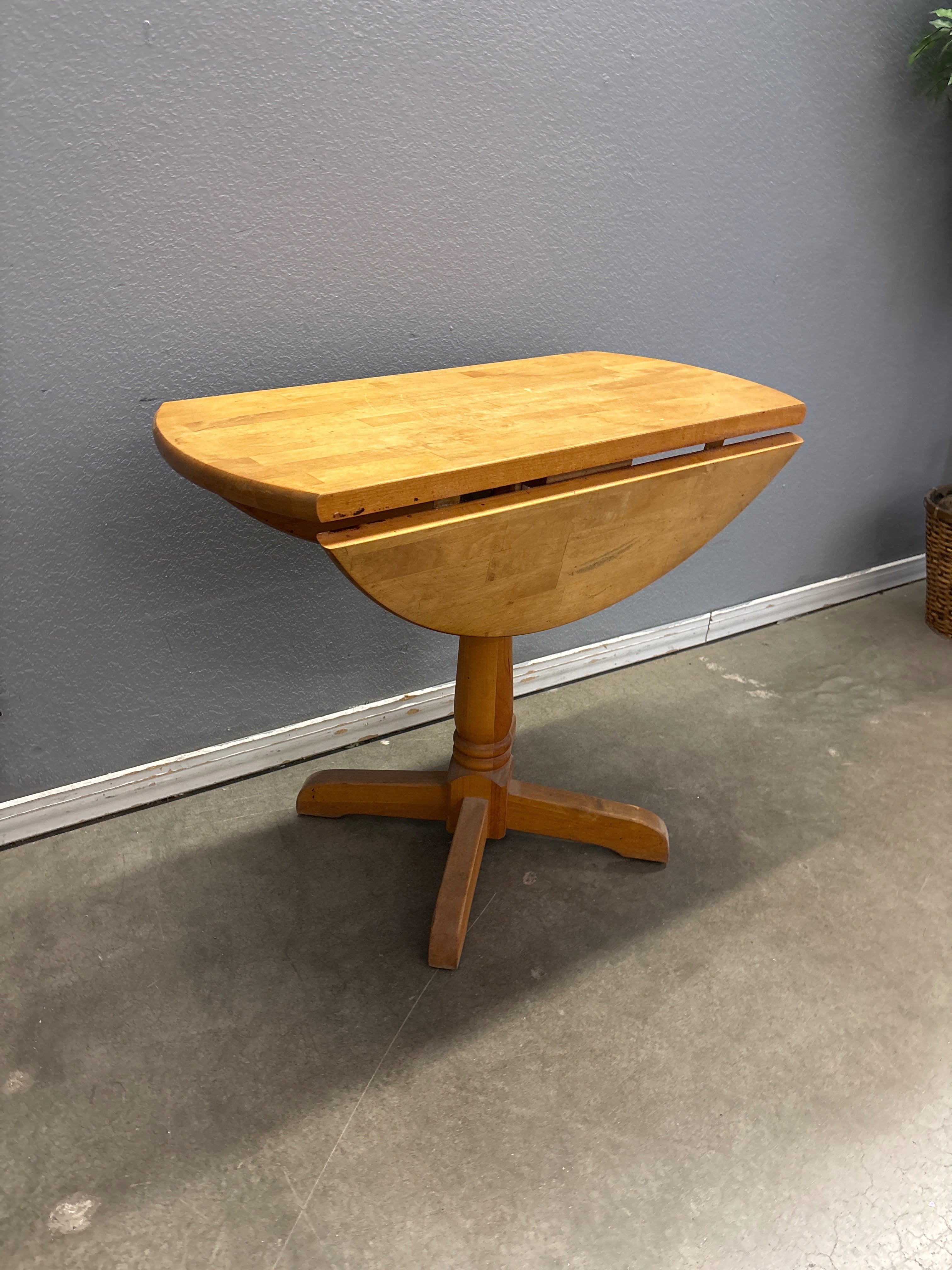 This charming vintage table features a natural wood color with a smooth finish. The drop-leaf design is perfect for versatile use and space-saving in smaller areas. Approximate Size: 2.5 x 2.5 x 1.5
