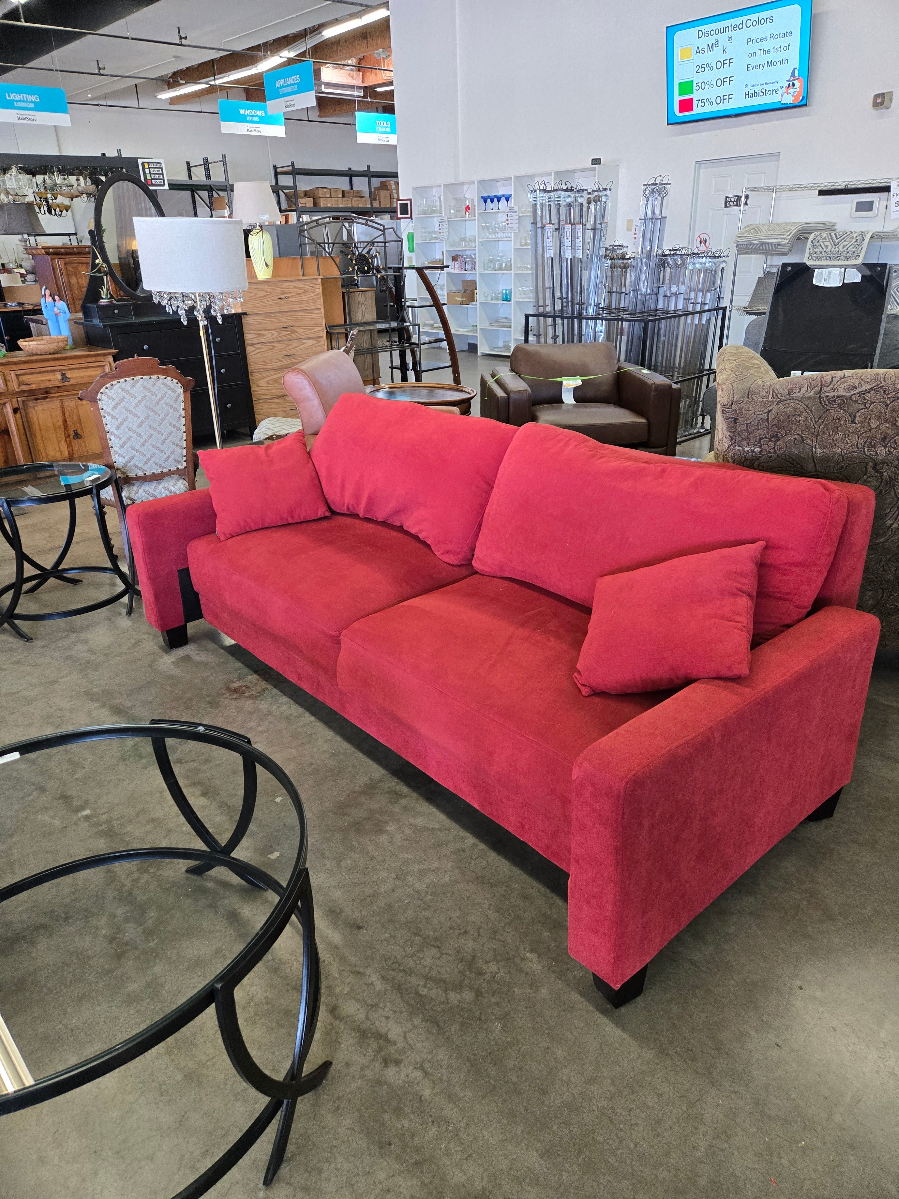 This vibrant red sofa features a plush fabric upholstery with a smooth finish. The couch includes spacious seating and plush cushion support, perfect for adding a pop of color to your living room decor. Approximate Size: 3 x 7 x 3