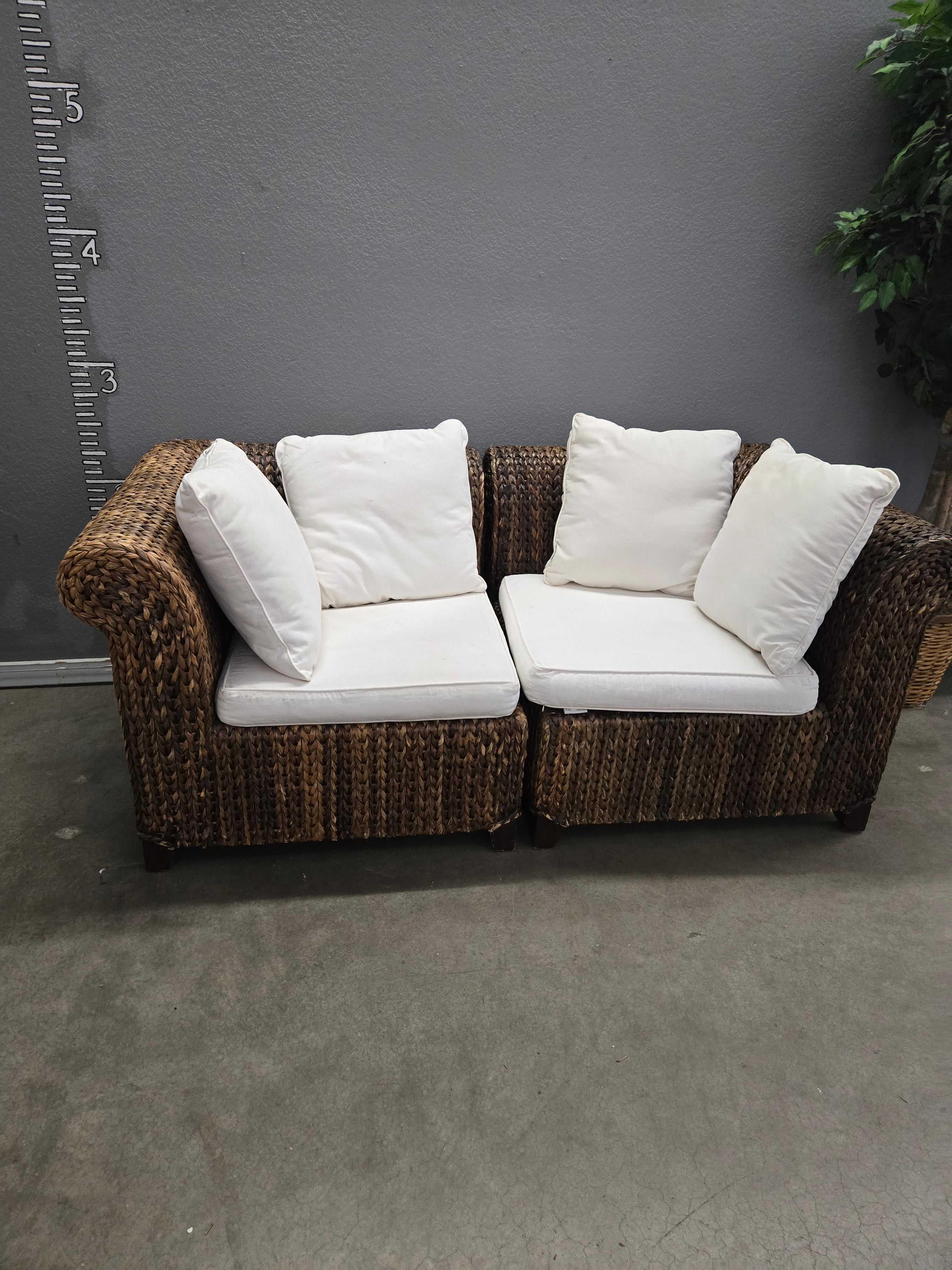 This loveseat features a natural wicker finish with white fabric cushions, perfect for a cozy seating arrangement. Ideal for indoor or outdoor spaces. Approximate Size: 3 x 5 x 3