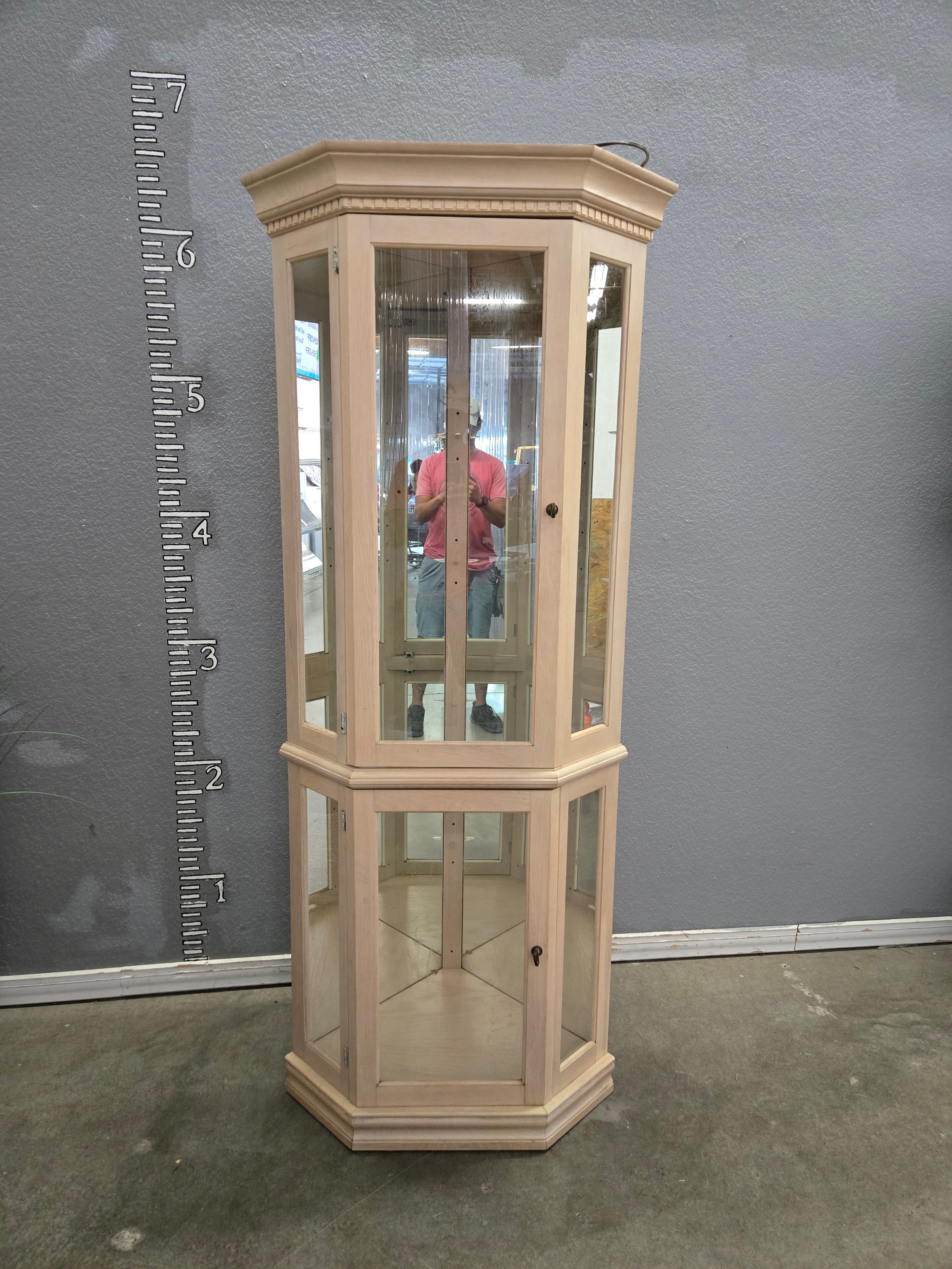 This elegant octagonal curio cabinet features a light beige wood finish with glass panels for a clear view of your collectibles. The cabinet's refined design includes a crown molding accent at the top, adding a touch of sophistication to any room. Approximate Size: 6.5 x 2 x 2