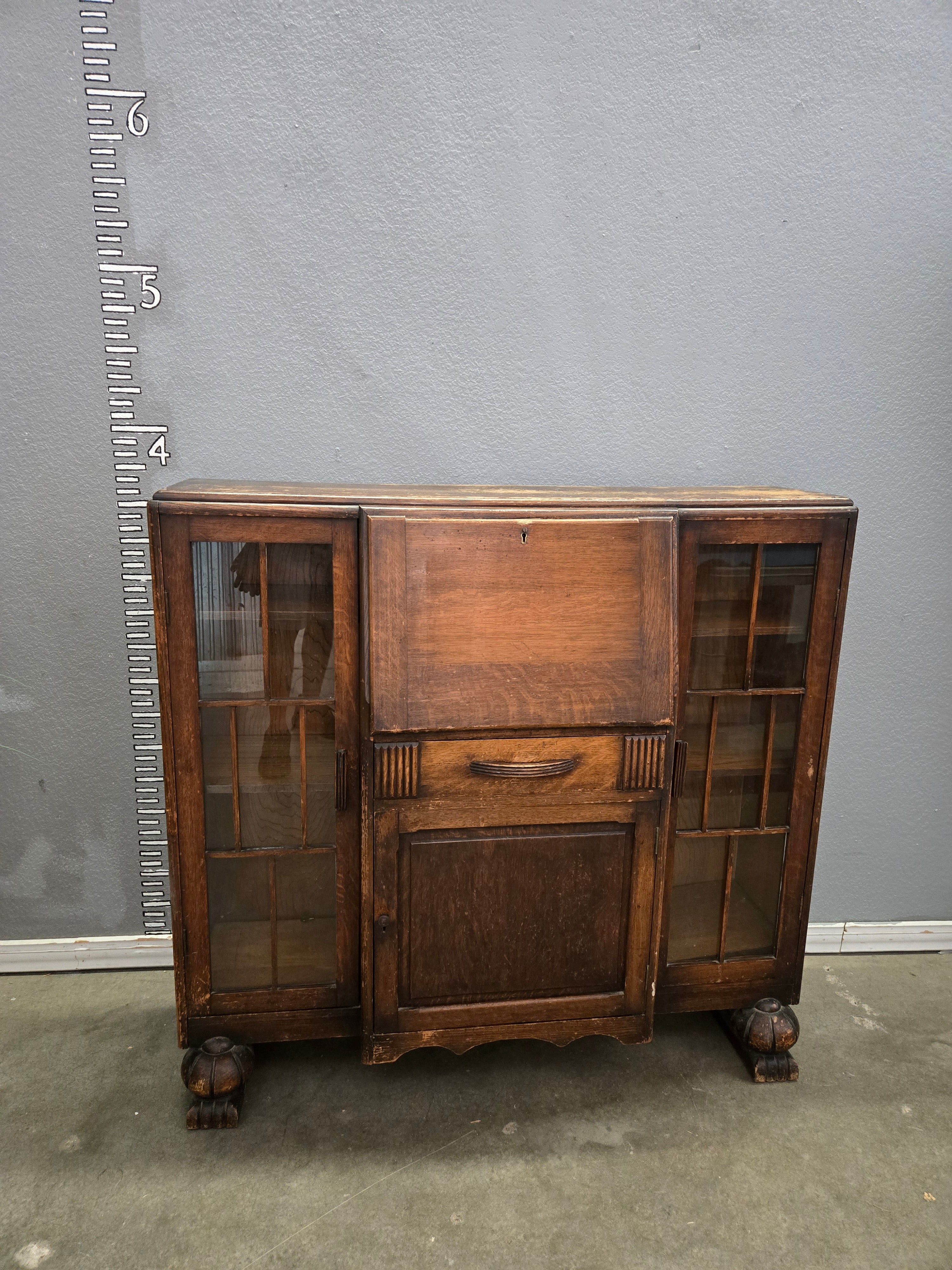 This exquisite vintage display cabinet features a rich brown wooden finish with glass panel doors. The cabinet is designed with a classic antique style, offering both functionality and elegance. Perfect for showcasing items in your living space. Approximate Size: 4.5 x 5 x 1.5