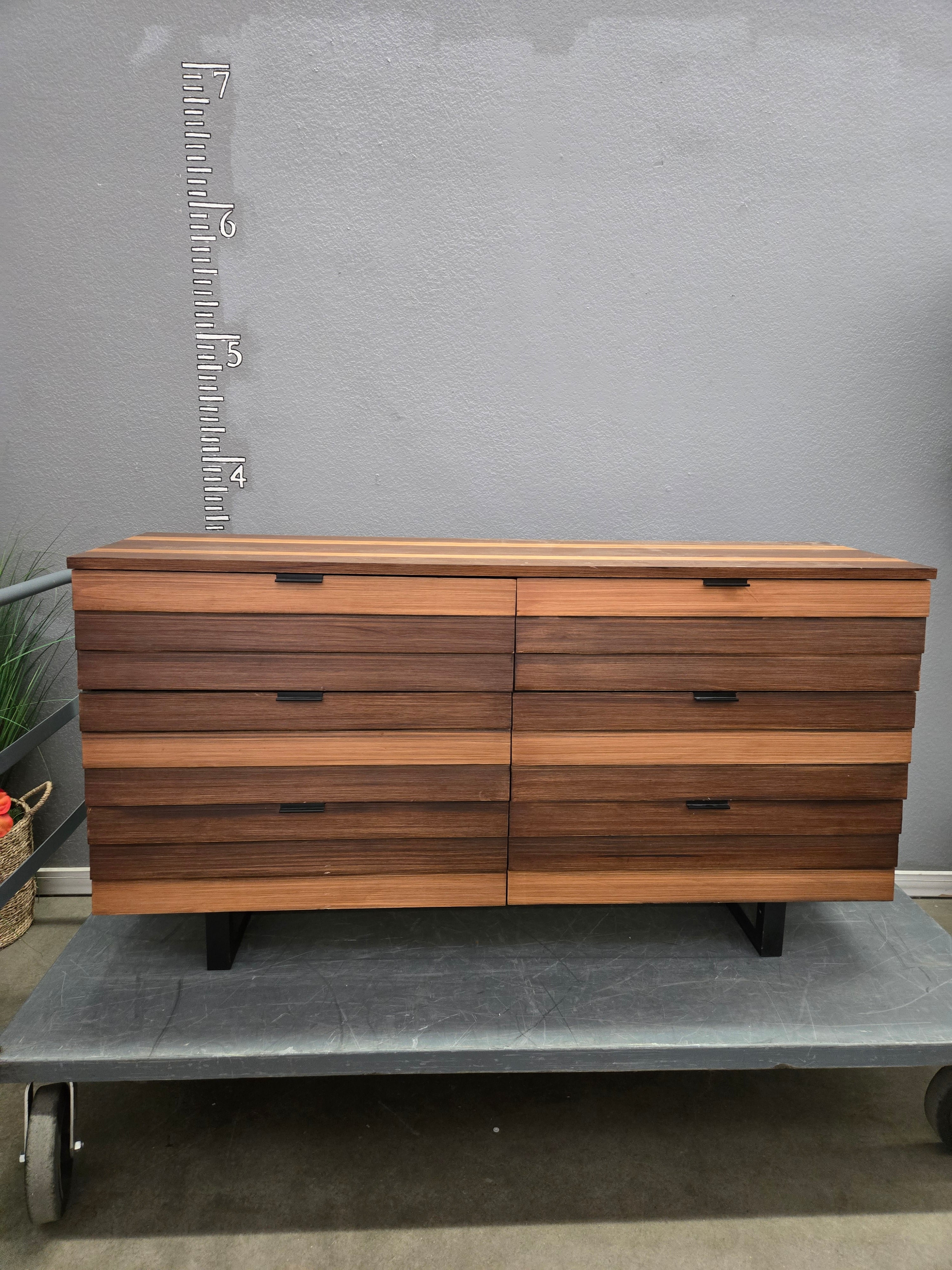 This dresser features a rich brown wood finish with sleek, horizontal lines and minimalist black handles. It's designed to bring a touch of elegance and functionality to any space. Approximate Size: 4 x 5 x 1.5