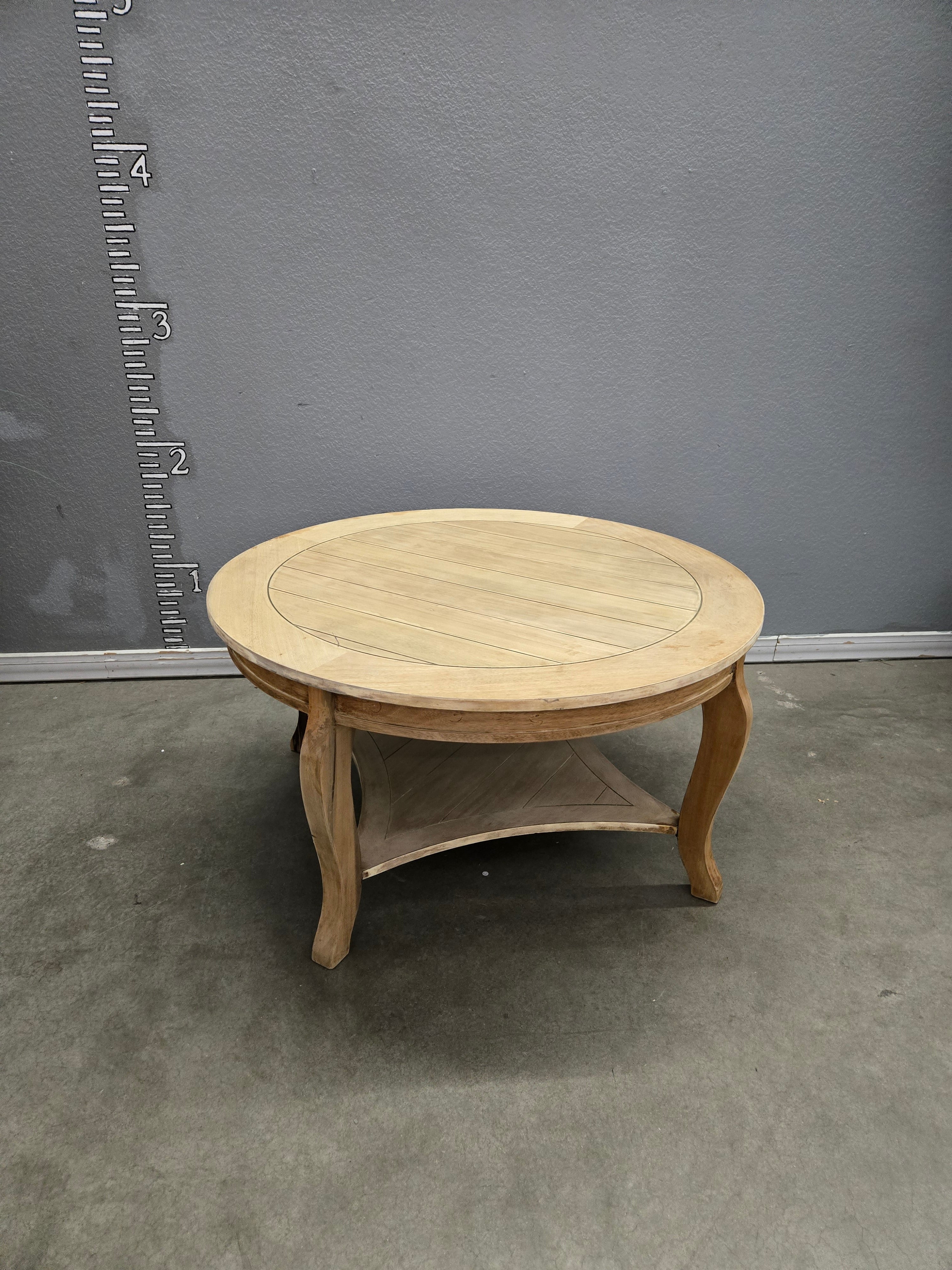 A beautifully designed round coffee table made from light-colored wood with a natural finish. This piece features elegant curved legs and a convenient lower shelf for additional storage. Approximate Size: 2 x 3 x 3