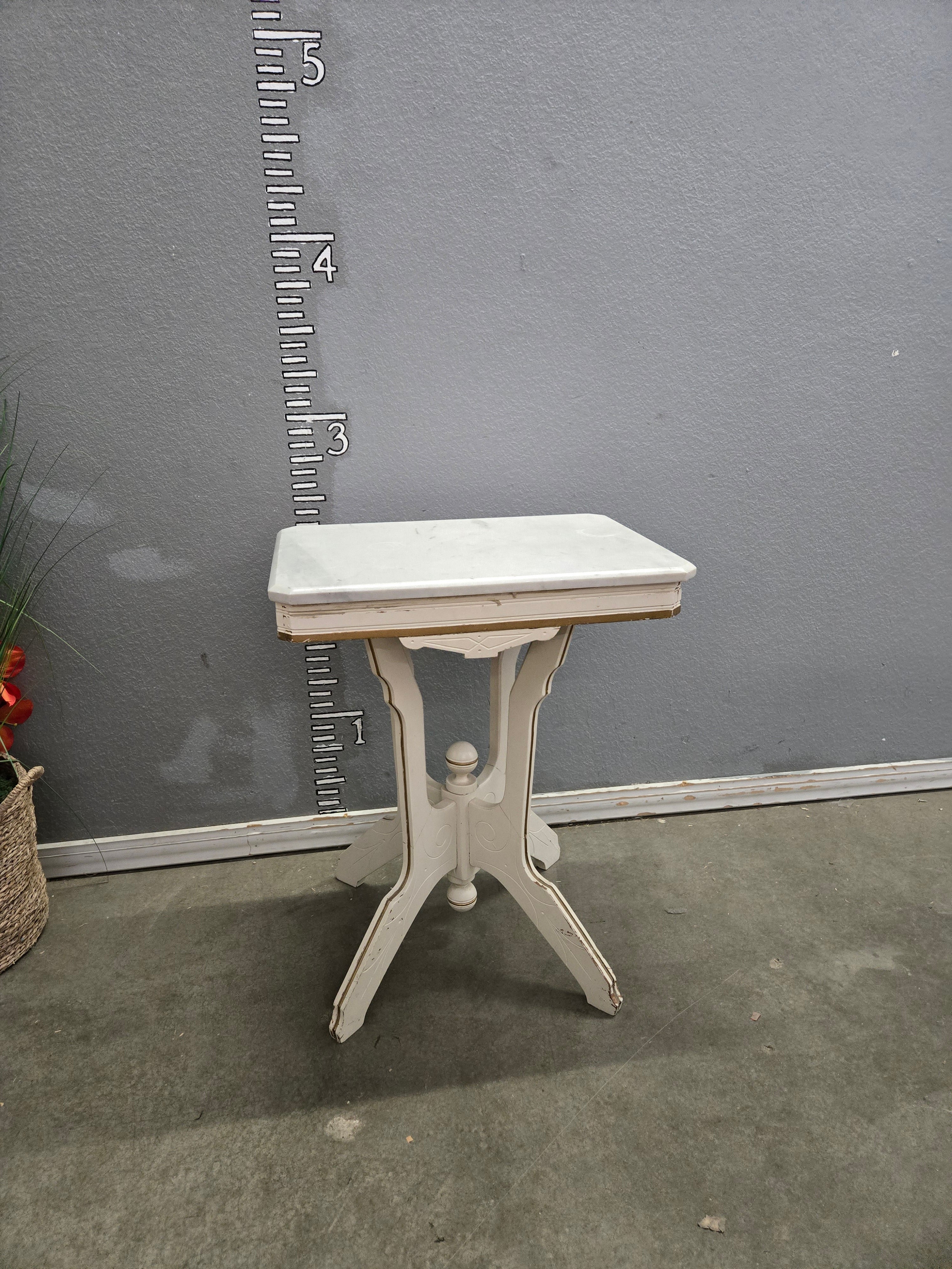 A charming white pedestal end table featuring a distressed finish, perfect for adding a touch of vintage elegance to any space. The table is crafted with a sturdy wooden base and a smooth tabletop, ideal for holding small items or displaying decor. Approximate Size: 2.5 x 1.5 x 1.5
