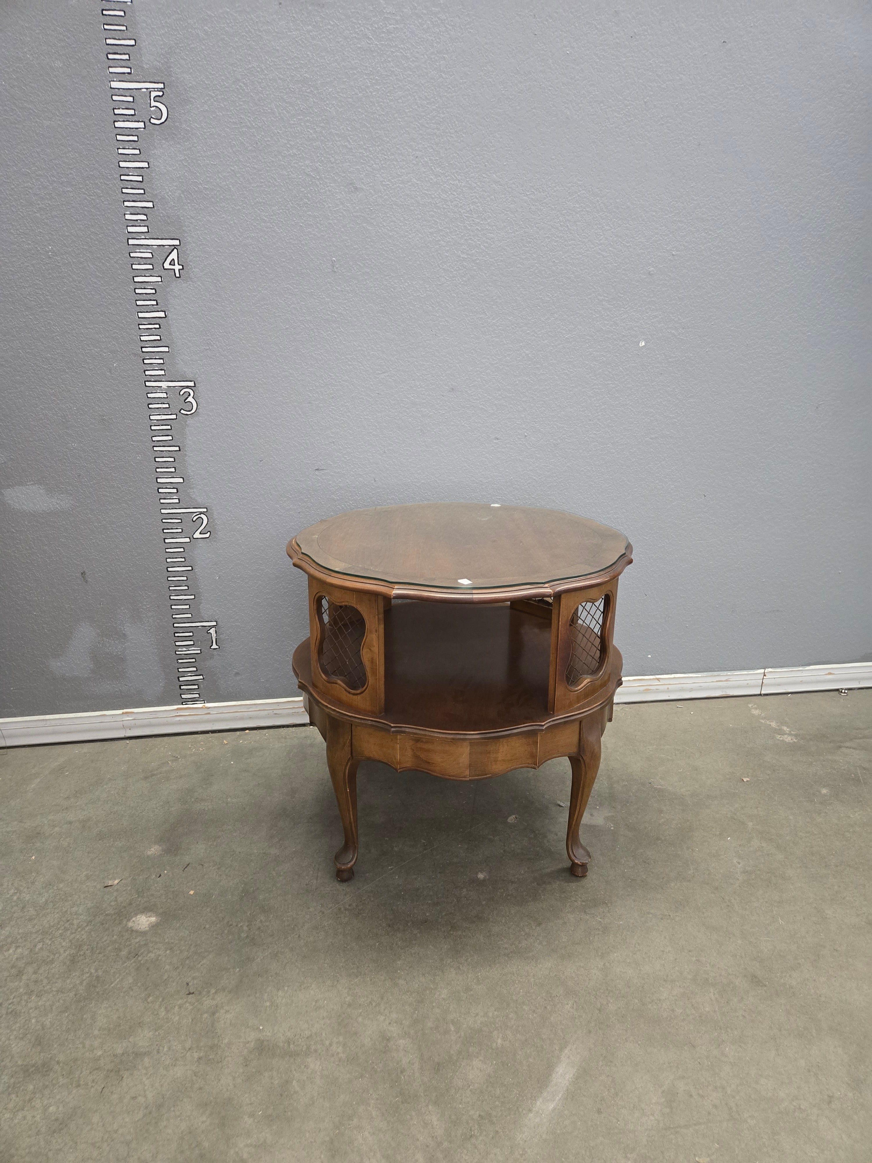 This beautiful vintage side table features a rich brown wooden finish with a smooth glass top. Its elegant, rounded design and sturdy construction make it a perfect addition to any living room decor. Approximate Size: 2.5 x 2 x 2