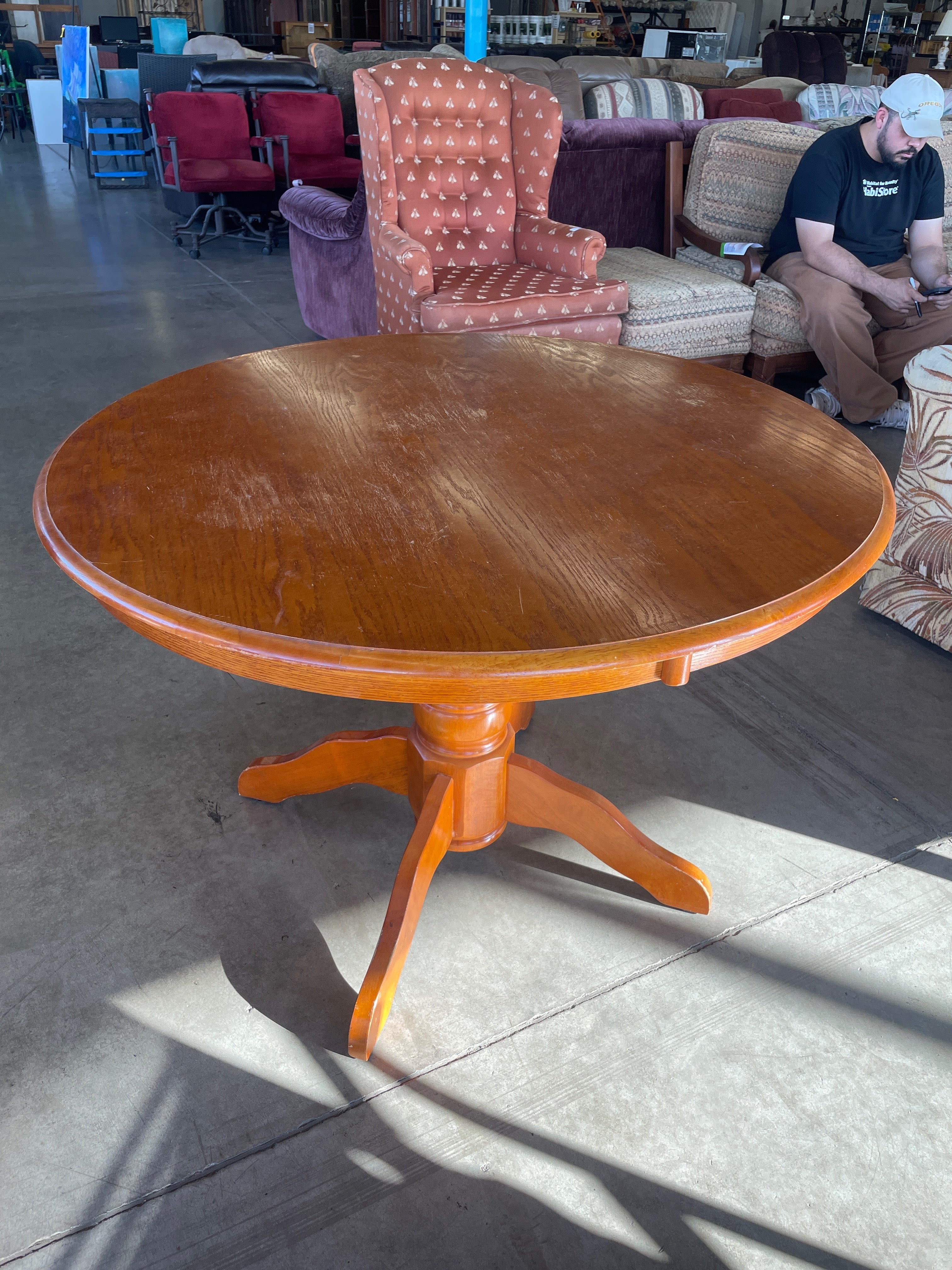 A classic round dining table featuring a rich brown finish with a glossy sheen. Crafted from sturdy wood, it brings timeless elegance to any dining room. Approximate Size: 2.5 x 4 x 4