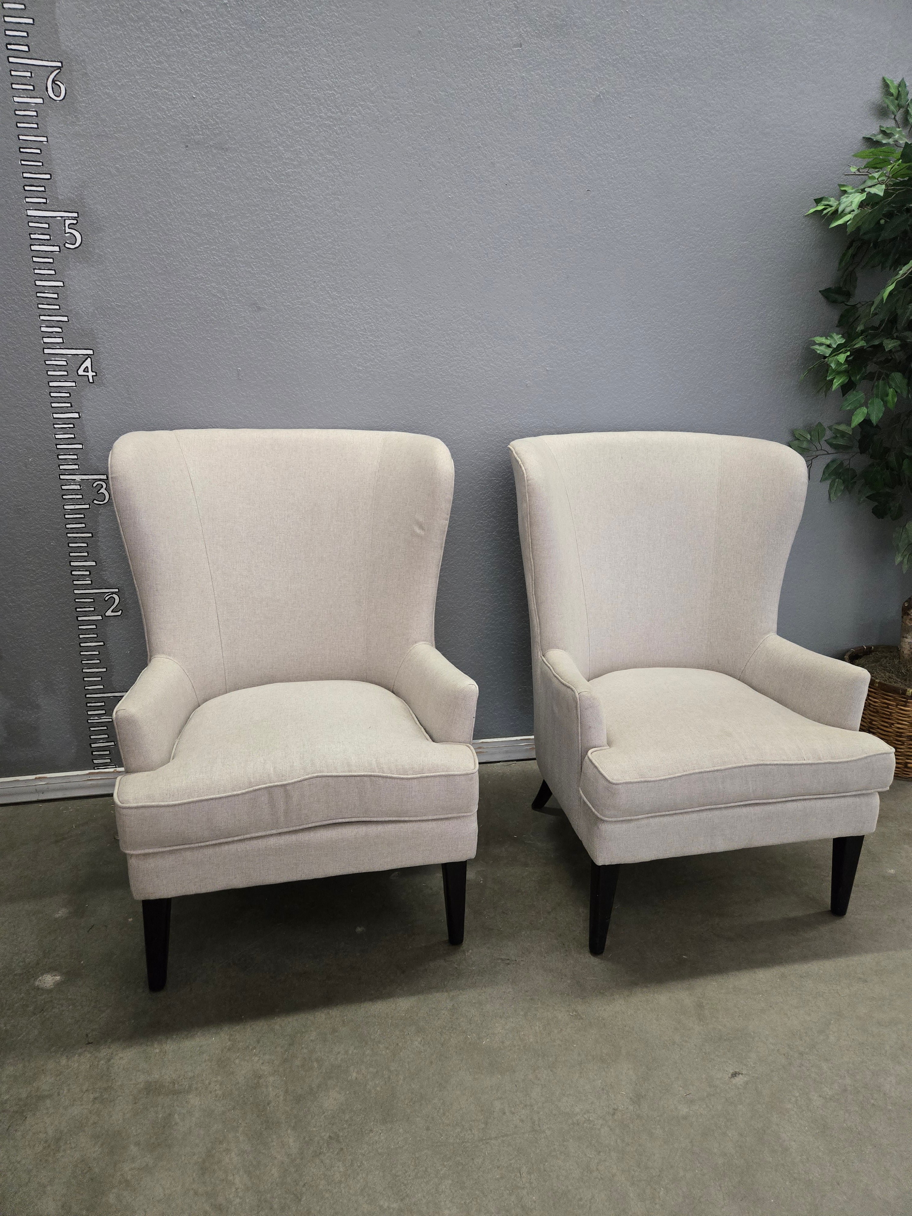 These elegant armchairs feature a soft beige fabric upholstery with a smooth finish. Ideal for adding a touch of sophistication to any living room setting. Approximate Size: 3 x 2.5 x 2