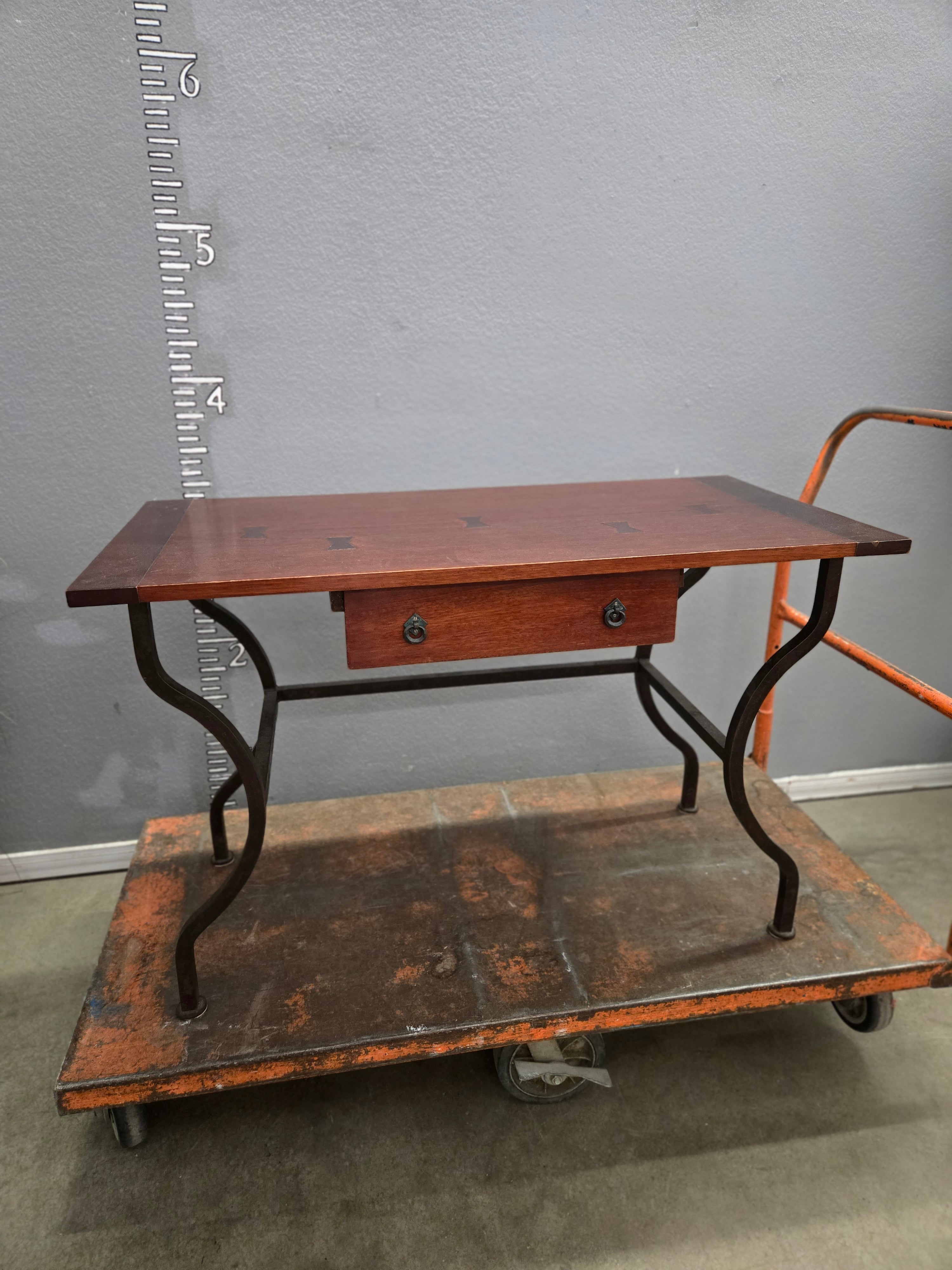 This charming vintage end table features a rich mahogany-colored wood top with an elegant matte finish. It has a single wooden drawer accented with metal pulls and stylish curved metal legs for stability. Approximate Size: 2 x 3 x 1.5