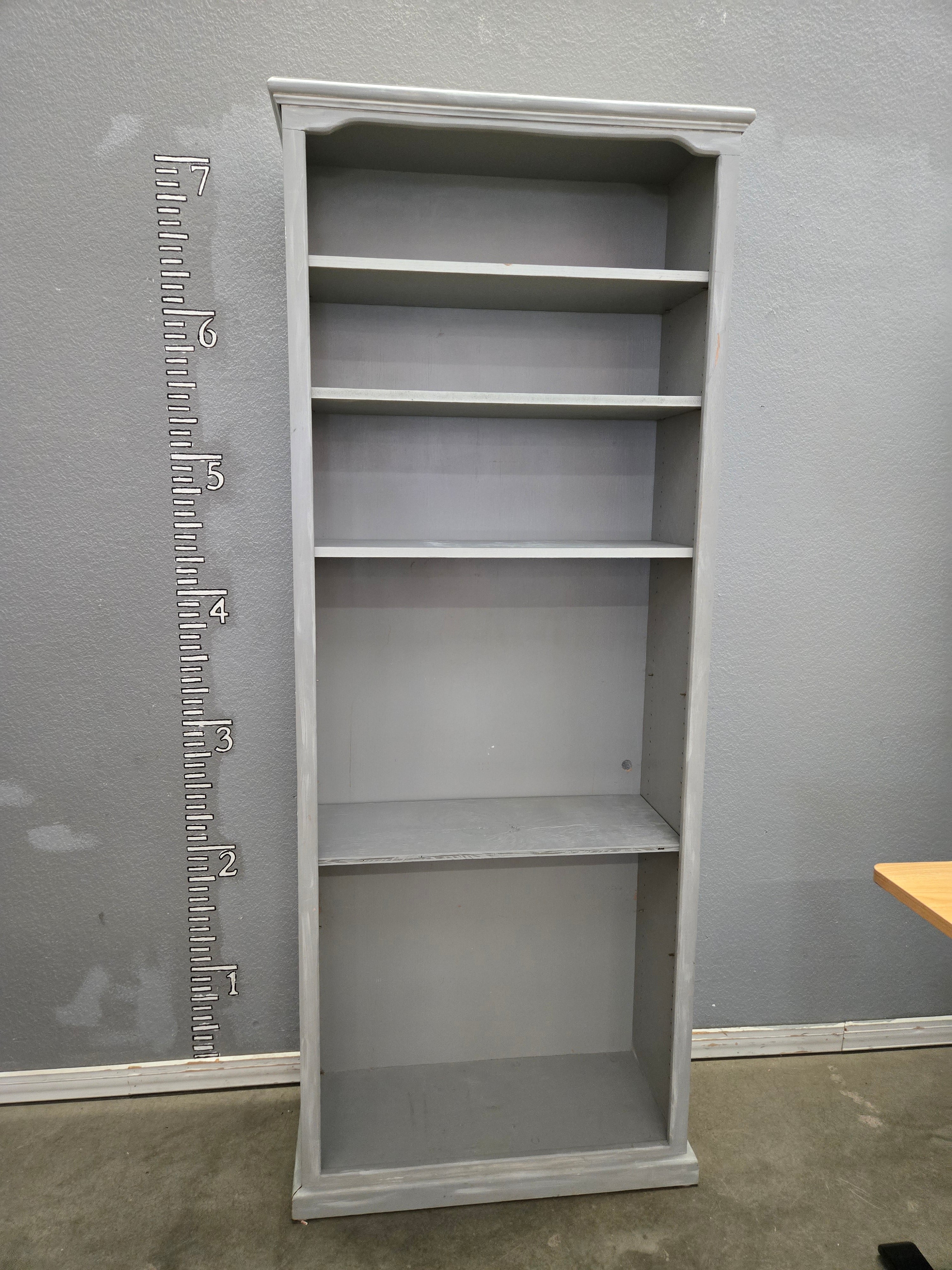 A tall wooden bookshelf featuring a smooth gray painted finish. This piece includes five spacious shelves, perfect for organizing books and décor items. The minimalist design blends seamlessly with any interior style. Approximate Size: 6.5 x 2.5 x 1